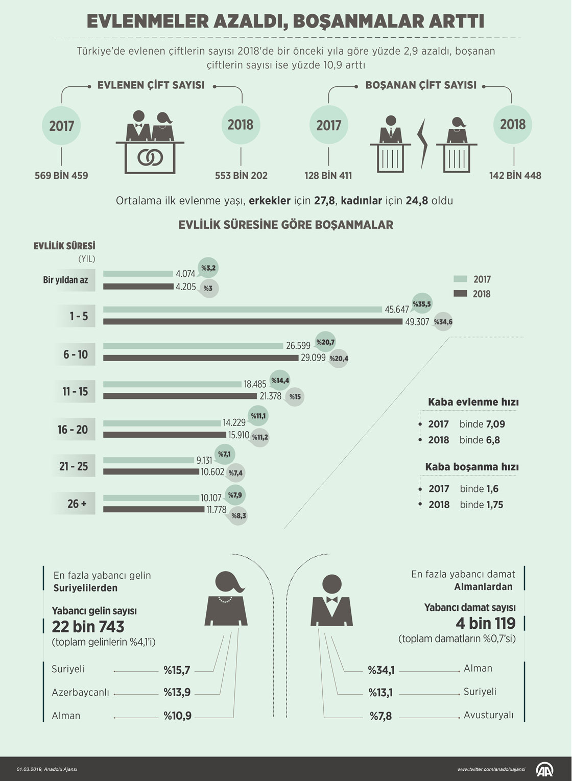 Türkiye'de geçen yıl evlenen çift sayısı 553 bin 202, boşanan çift sayısı ise 142 bin 448 oldu. Evlenen çiftlerin sayısı 2018 yılında bir önceki yıla göre yüzde 2,9 azalırken, boşanan çiftlerin sayısı yüzde 10,9 artış gösterdi. (Gözde Gültekinler-Anadolu Ajansı)01 Mart 2019•Güncelleme: 01 Mart 2019