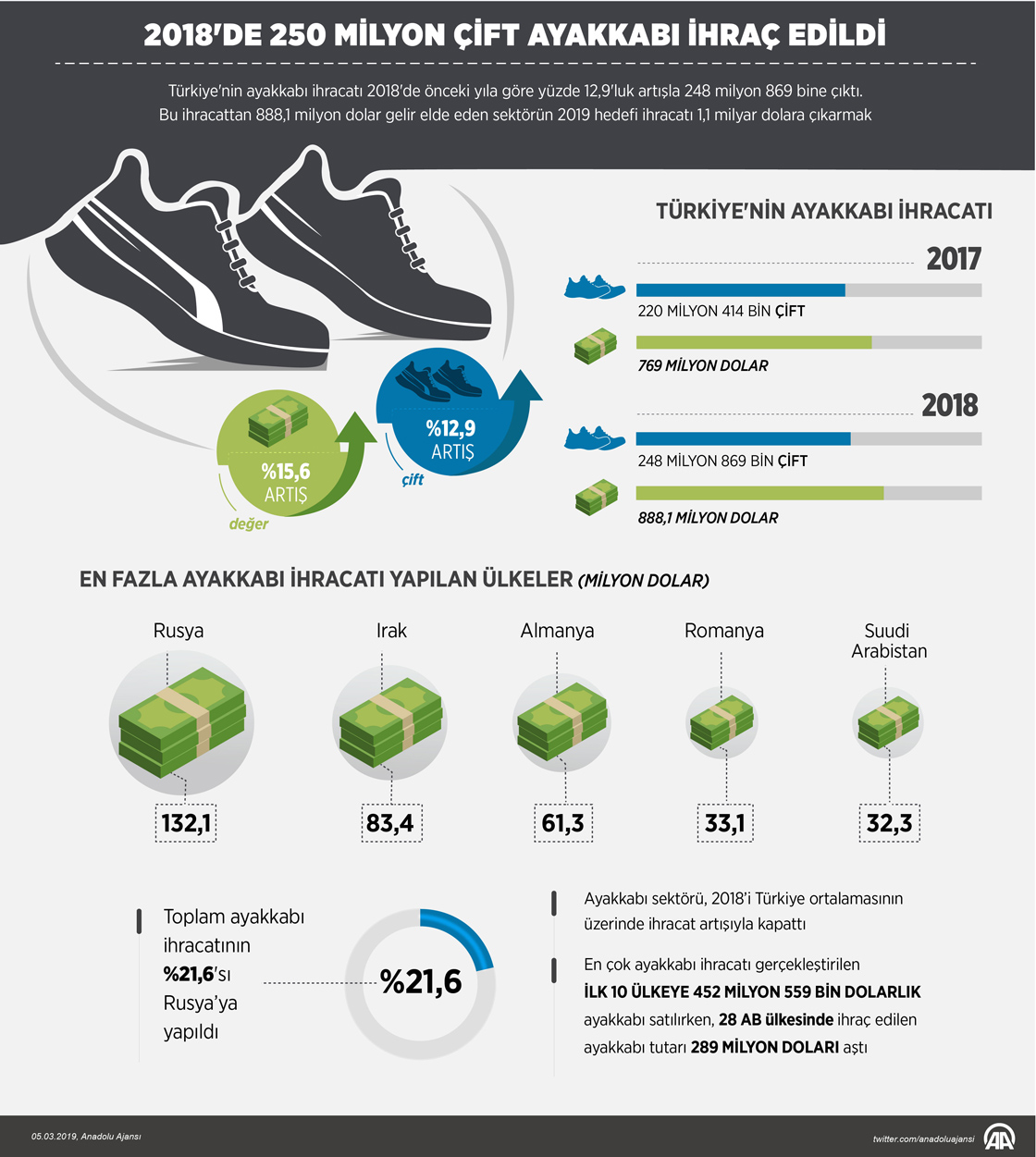 Türkiye'nin ayakkabı ihracatı 2018'de önceki yıla göre yüzde 12,9'luk artışla 248 milyon 869 bine çıktı. Bu ihracattan 888,1 milyon dolar gelir elde eden sektörün 2019 hedefi ihracatı 1,1 milyar dolara çıkarmak. ( Gözde Gültekinler - Anadolu Ajansı )05 Mart 2019•Güncelleme: 05 Mart 2019