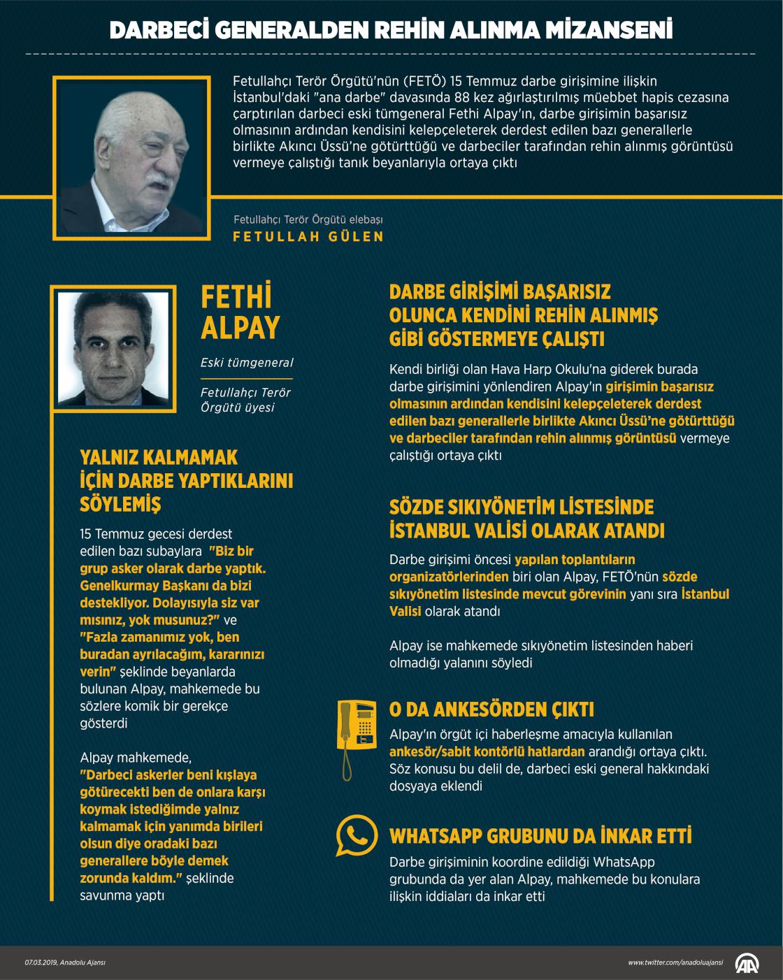 Fetullahçı Terör Örgütü'nün (FETÖ) 15 Temmuz darbe girişimine ilişkin İstanbul'daki "ana darbe" davasında 88 kez ağırlaştırılmış müebbet hapis cezasına çarptırılan darbeci eski Tümgeneral Fethi Alpay'ın, darbe girişimin başarısız olmasının ardından kendisini kelepçeleterek derdest edilen bazı generallerle birlikte Akıncı Üssü'ne götürttüğü ve darbeciler tarafından rehin alınmış havası vermeye çalıştığı tanık beyanlarıyla ortaya çıktı. ( Yasin Demirci - Anadolu Ajansı )07 Mart 2019•Güncelleme: 07 Mart 2019