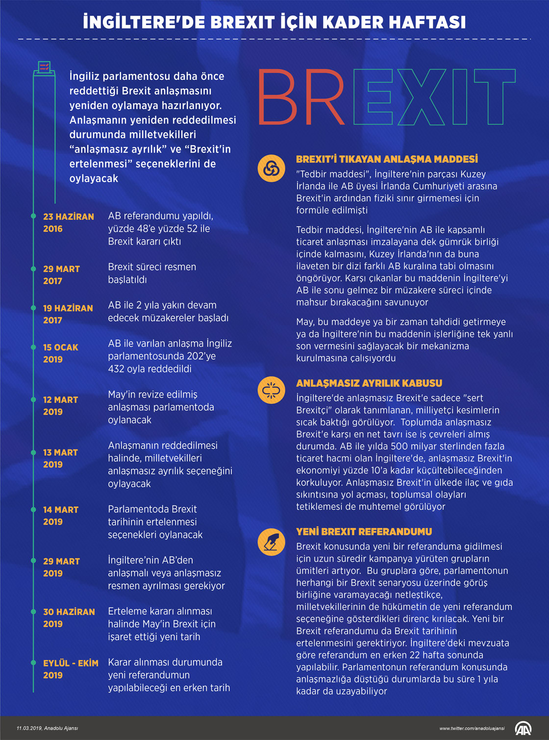 İngiliz parlamentosu daha önce reddettiği Brexit anlaşmasını yeniden oylamaya hazırlanıyor. Anlaşmanın yeniden reddedilmesi durumunda milletvekilleri “anlaşmasız ayrılık” ve “Brexit'in ertelenmesi” seçeneklerini de oylayacak.