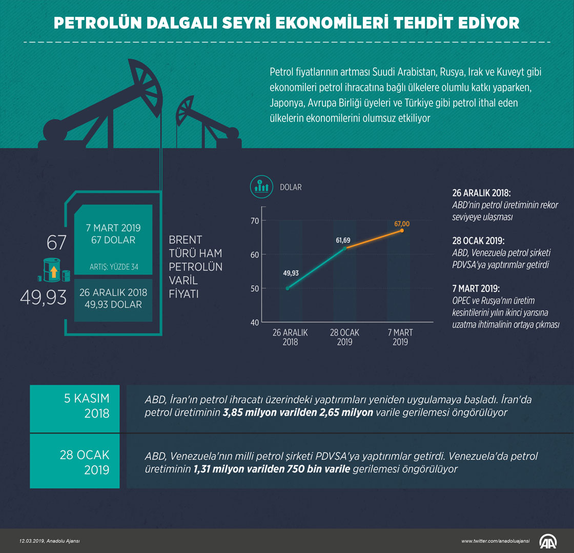 Petrol fiyatlarının dalgalı seyri petrol ithal eden ülkelerin ekonomilerini tehdit ediyor. Dünya genelinde en yaygın kullanılan Brent türü ham petrolün varil fiyatı 26 Aralık'ta 49,93 dolara kadar geriledi. Geçen hafta perşembe günü ise 67 dolara kadar yükseldi. Böylece petrolün varil fiyatı söz konusu dönemde yüzde 34 arttı.