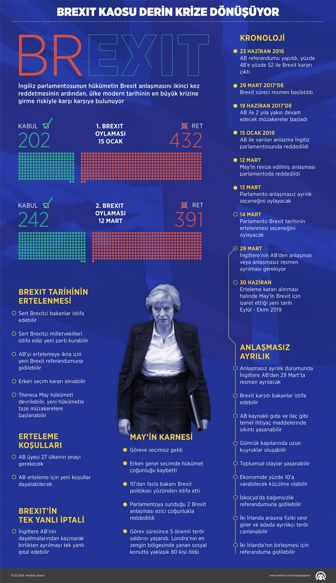 İngiliz parlamentosunun hükümetin Brexit anlaşmasını ikinci kez reddetmesinin ardından ülke, yakın tarihinin en büyük krizine girme riskiyle karşı karşıya bulunuyor. İngiliz parlamentosunun bugün ve yarın oylaması öngörülen "anlaşmasız ayrılık" ve "Brexit'in ertelenmesi" seçenekleri ülke için pek çok komplikasyon barındırıyor. ( Yasin Demirci - Anadolu Ajansı )13 Mart 2019•Güncelleme: 13 Mart 2019
