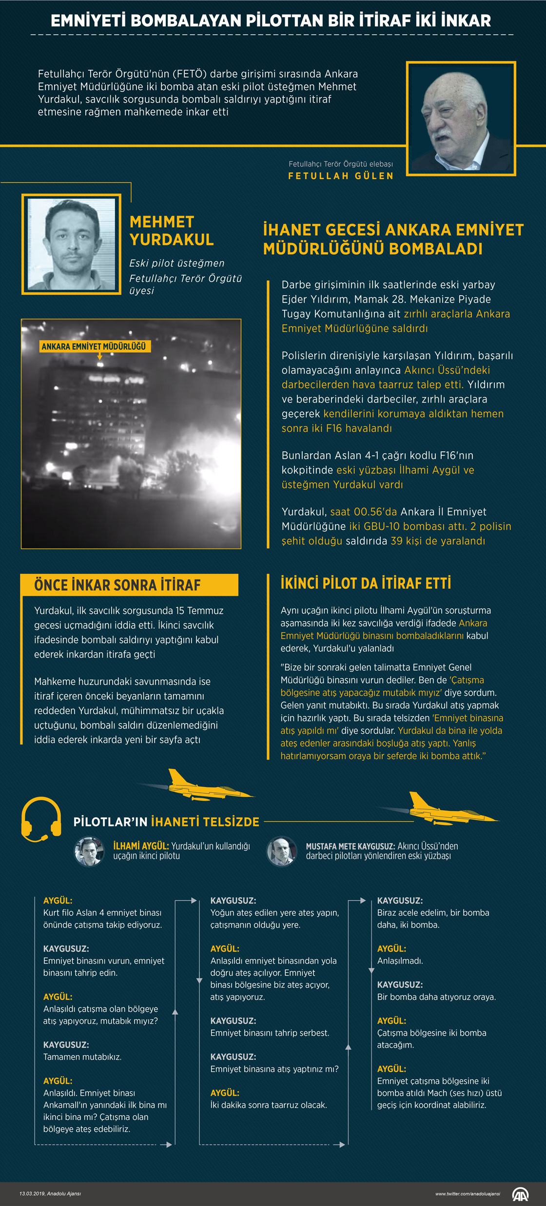 Fetullahçı Terör Örgütü'nün (FETÖ) darbe girişimi sırasında Ankara Emniyet Müdürlüğüne iki bomba atan eski pilot üsteğmen Mehmet Yurdakul, savcılık sorgusunda bombalı saldırıyı yaptığını itiraf etmesine rağmen mahkemede inkar etti. ( Kemal Delikmen - Anadolu Ajansı )13 Mart 2019•Güncelleme: 13 Mart 2019