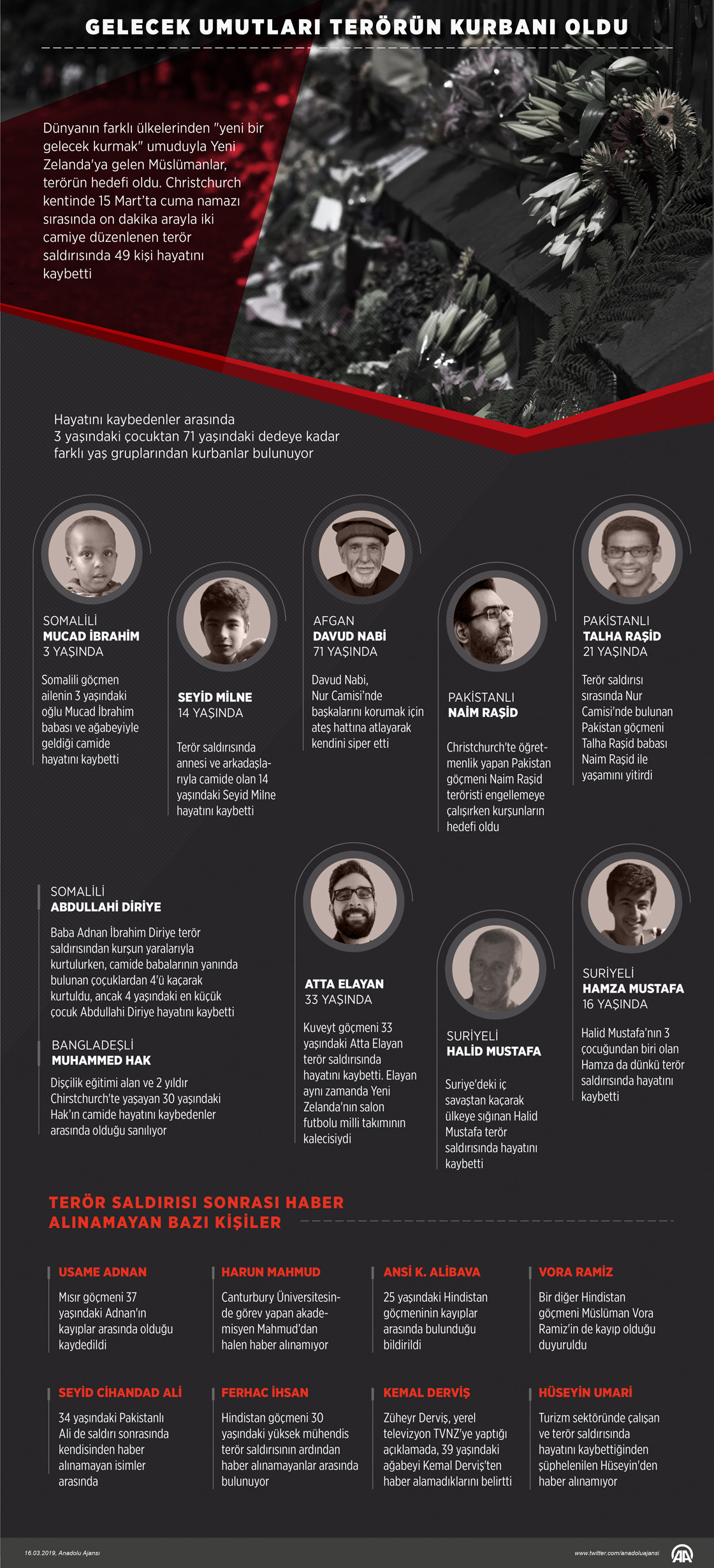 Dünyanın farklı ülkelerinden "yeni bir gelecek kurmak" umuduyla Yeni Zelanda'ya gelen Müslümanlar, terörün hedefi oldu. Christchurch kentinde 15 Mart’ta cuma namazı sırasında on dakika arayla iki camiye düzenlenen terör saldırısında 49 kişi hayatını kaybetti
