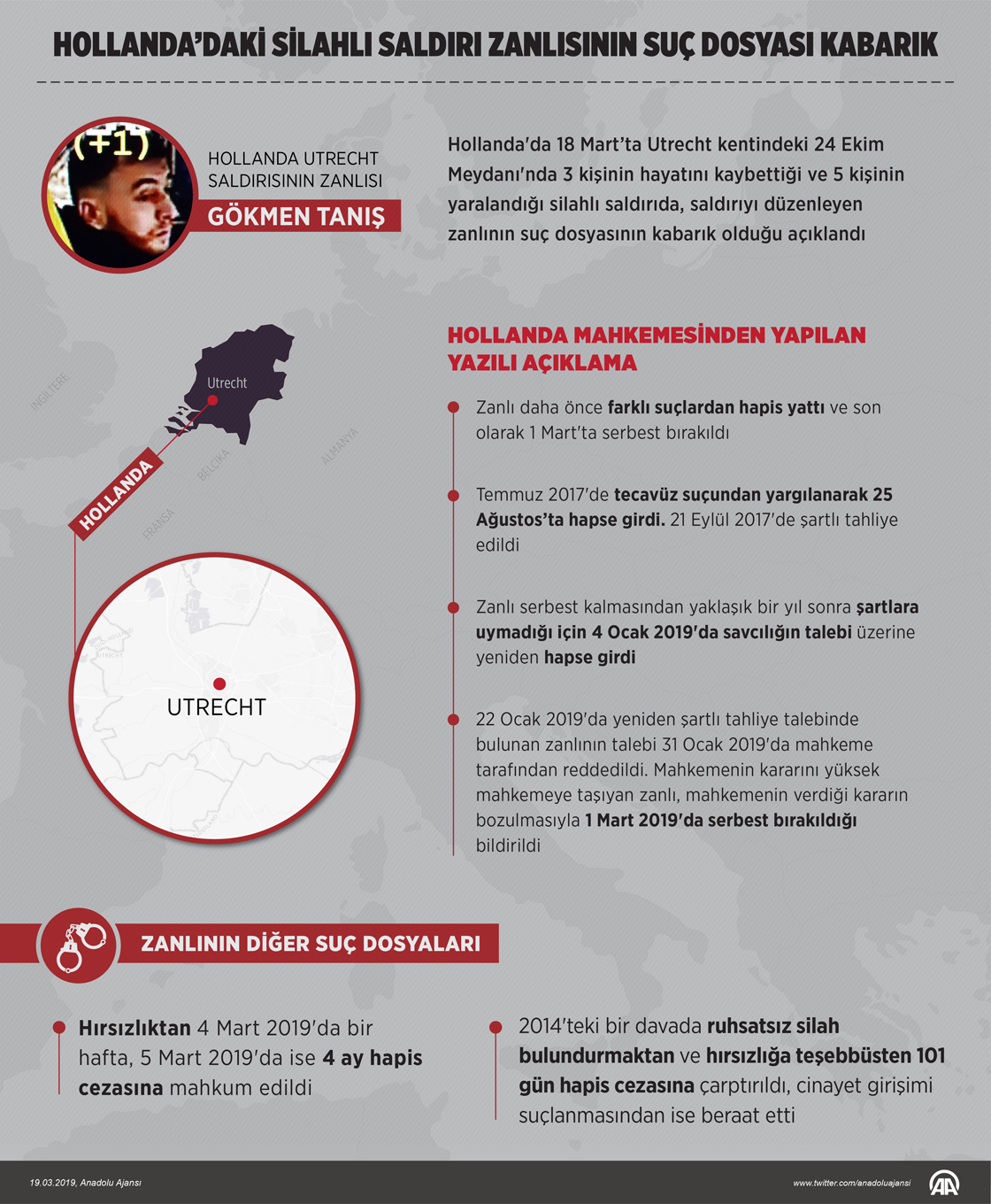 Hollanda'da 18 Mart’ta Utrecht kentindeki 24 Ekim Meydanı'nda 3 kişinin hayatını kaybettiği ve 5 kişinin yaralandığı silahlı saldırıda, saldırıyı düzenleyen zanlının suç dosyasının kabarık olduğu açıklandı. Grafik: AA/Muhammed Ali Yiğit19 Mart 2019•Güncelleme: 19 Mart 2019