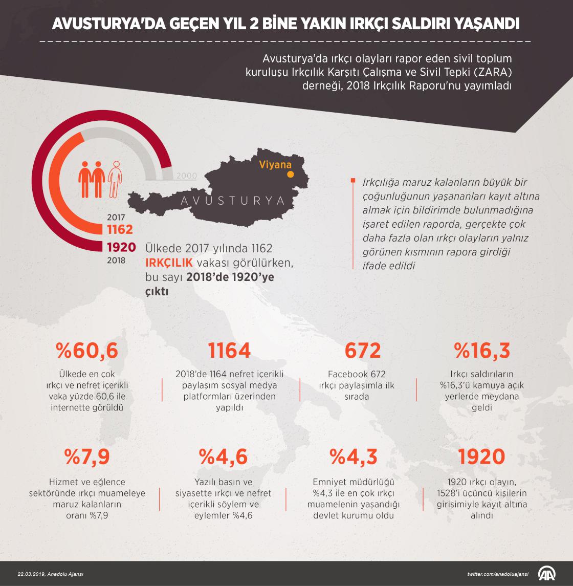 Avusturya’da ırkçı olayları rapor eden sivil toplum örgütü Irkçılık Karşıtı Çalışma ve Sivil Tepki (ZARA) derneği, 2018 Irkçılık Raporu'nu yayımladı. Rapora göre, Avusturya'da 2017'de bin 162 olan ırkçı saldırı, geçen yıl bin 920'ye yükseldi. Ülkede en çok ırkçı ve nefret içerikli vaka yüzde 60,6 ile internette görüldü.