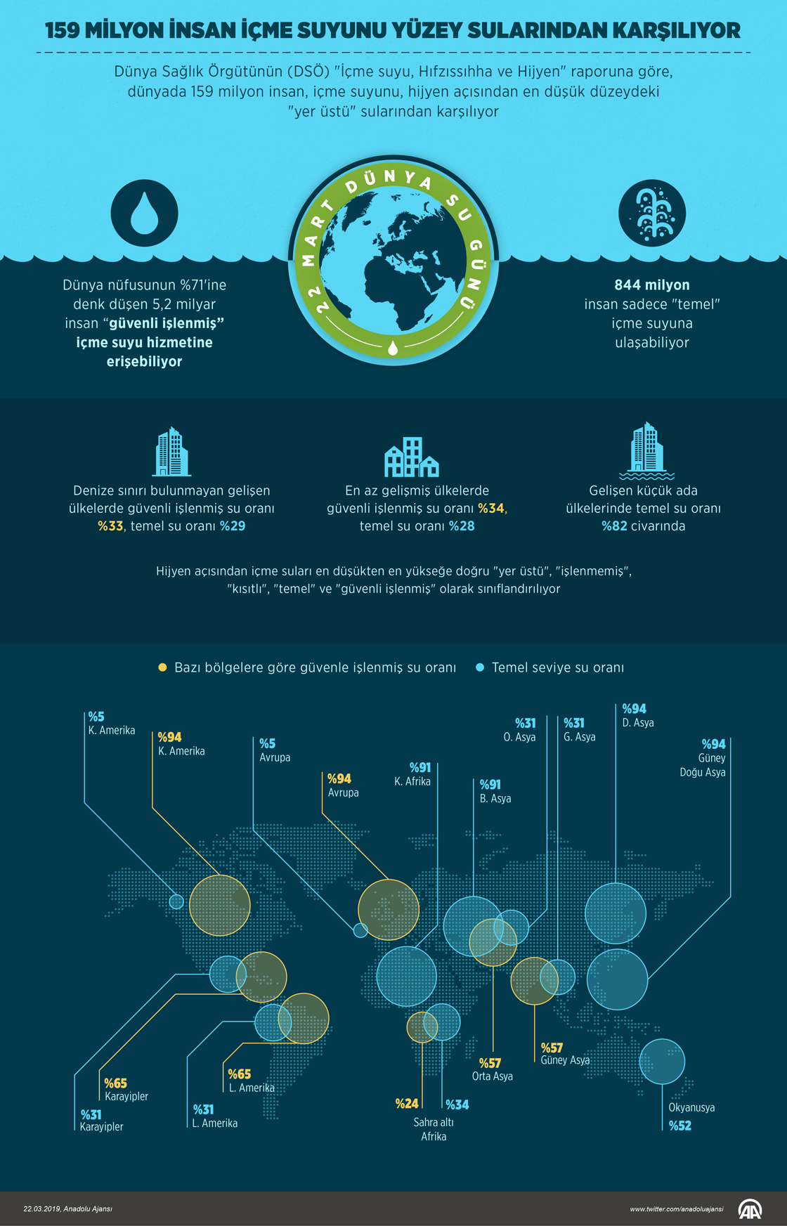 Dünya Sağlık Örgütünün (DSÖ) "İçme suyu, Hıfzıssıhha ve Hijyen" raporuna göre, dünyada 159 milyon insan, içme suyunu, hijyen açısından en düşük düzeydeki "yer üstü" sularından karşılıyor.