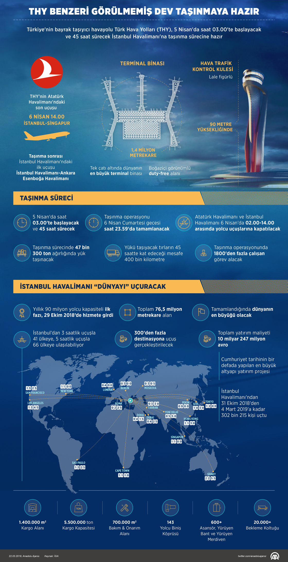 Türkiye'nin bayrak taşıyıcı havayolu Türk Hava Yolları (THY), 5 Nisan'da saat 03.00'te başlayacak ve 45 saat sürecek İstanbul Havalimanı'na taşınma sürecine hazır.