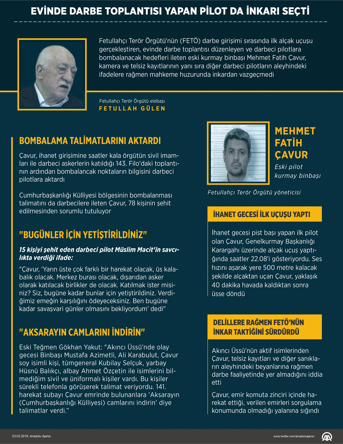 Fetullahçı Terör Örgütü'nün (FETÖ) darbe girişimi sırasında ilk alçak uçuşu gerçekleştiren, evinde darbe toplantısı düzenleyen ve darbeci pilotlara bombalanacak hedefleri ileten eski kurmay binbaşı Mehmet Fatih Çavur, kamera ve telsiz kayıtlarının yanı sıra diğer darbeci pilotların aleyhindeki ifadelere rağmen mahkeme huzurunda inkarı elden bırakmadı. (Muhammed Ali Yiğit-Anadolu Ajansı)23 Mart 2019•Güncelleme: 23 Mart 2019