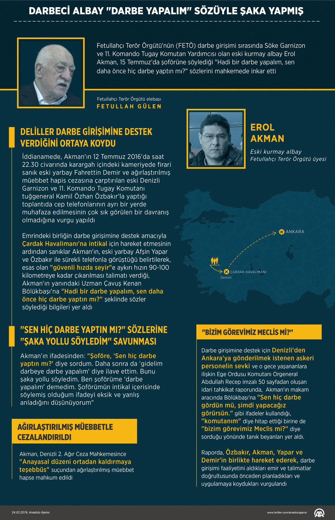 Fetullahçı Terör Örgütü'nün (FETÖ) darbe girişimi sırasında Söke Garnizon ve 11. Komando Tugay Komutan Yardımcısı olan eski kurmay albay Erol Akman, 15 Temmuz'da şoförüne söylediği "Hadi bir darbe yapalım, sen daha önce hiç darbe yaptın mı?" sözlerini mahkemede inkar etti. ( GRAFİK: Kemal Delikmen - Anadolu Ajansı )24 Mart 2019•Güncelleme: 24 Mart 2019