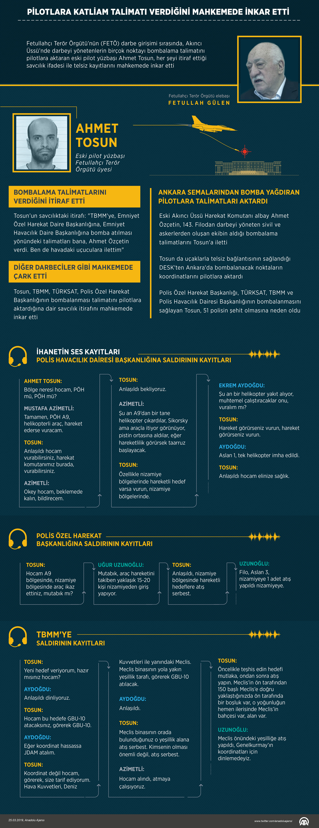 Fetullahçı Terör Örgütü'nün (FETÖ) darbe girişimi sırasında, Akıncı Üssü'nde darbeyi yönetenlerin birçok noktayı bombalama talimatını pilotlara aktaran eski pilot yüzbaşı Ahmet Tosun, her şeyi itiraf ettiği savcılık ifadesi ile telsiz kayıtlarını mahkemede inkar etti25 Mart 2019•Güncelleme: 25 Mart 2019