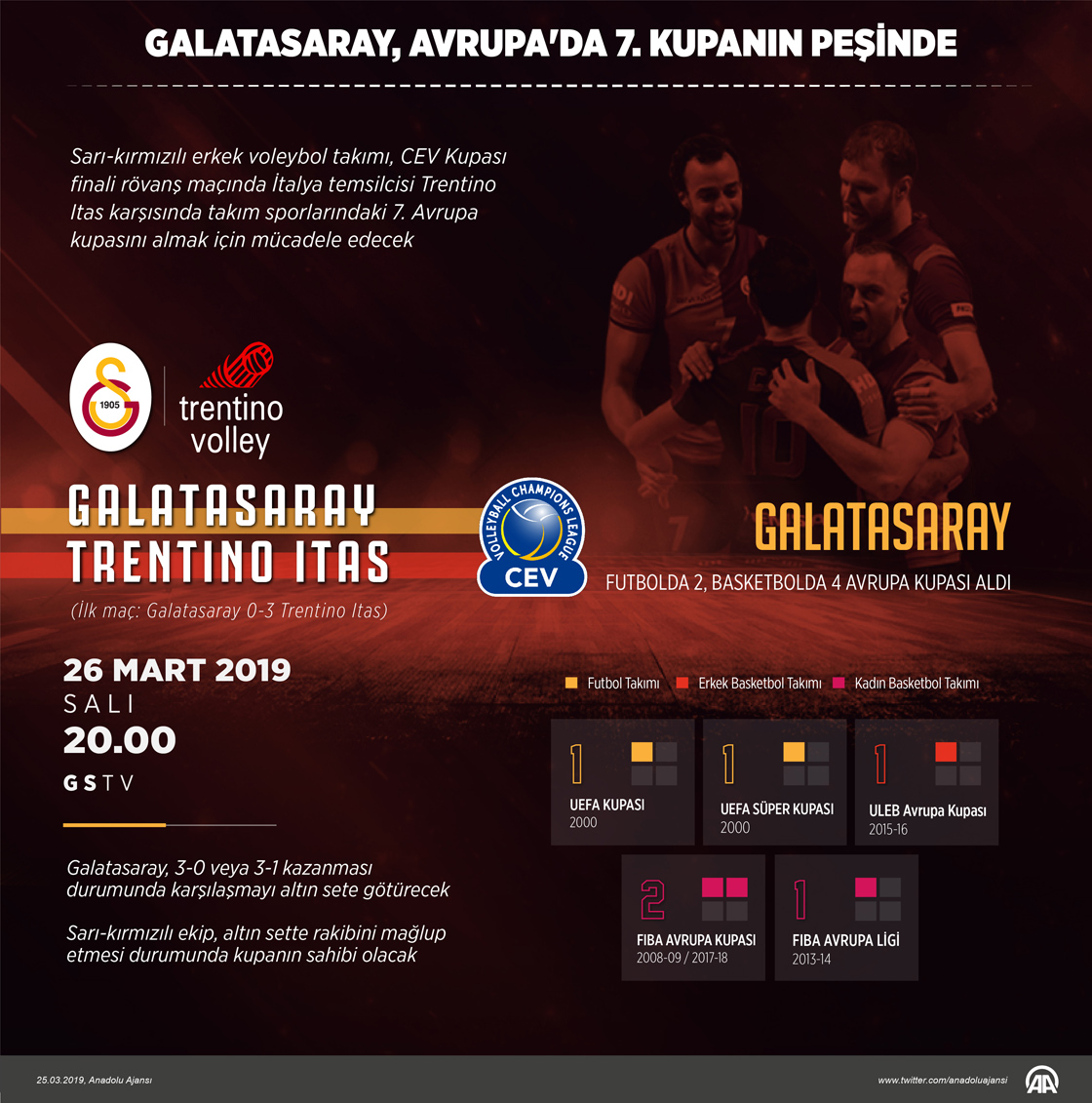Voleybol Erkekler CEV Kupası finali rövanş maçında yarın İtalya temsilcisi Trentino Itas'ı konuk edecek Galatasaray, başı çeken takım sporları futbol, basketbol ve voleybolda toplamda 7. Avrupa kupasını kazanmayı hedefliyor. ( Kemal Delikmen - Anadolu Ajansı )25 Mart 2019•Güncelleme: 25 Mart 2019