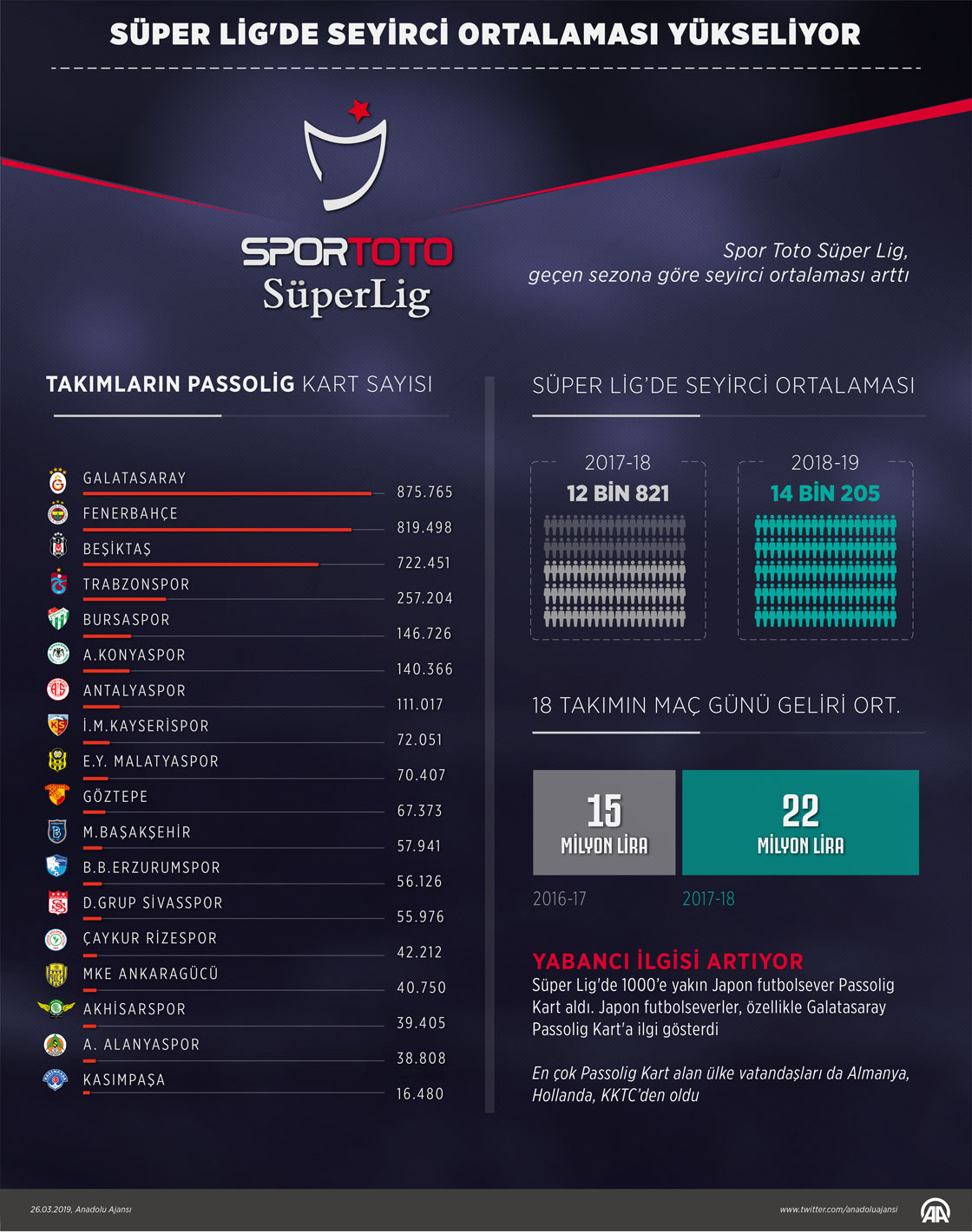 Spor Toto Süper Lig'de, geçen sezona göre seyirci ortalaması arttı. Passolig yetkililerinden alınan bilgiye göre Süper Lig'in geçen sezonki maçlarını ortalama 12 bin 821 kişi izledi. Ligde bu sezon ise söz konusu sayı 14 bin 205'e çıktı. Süper Lig'deki seyirci ortalaması geçen sezona göre bin 384 kişi arttı. ( Kemal Delikmen - Anadolu Ajansı )26 Mart 2019•Güncelleme: 26 Mart 2019