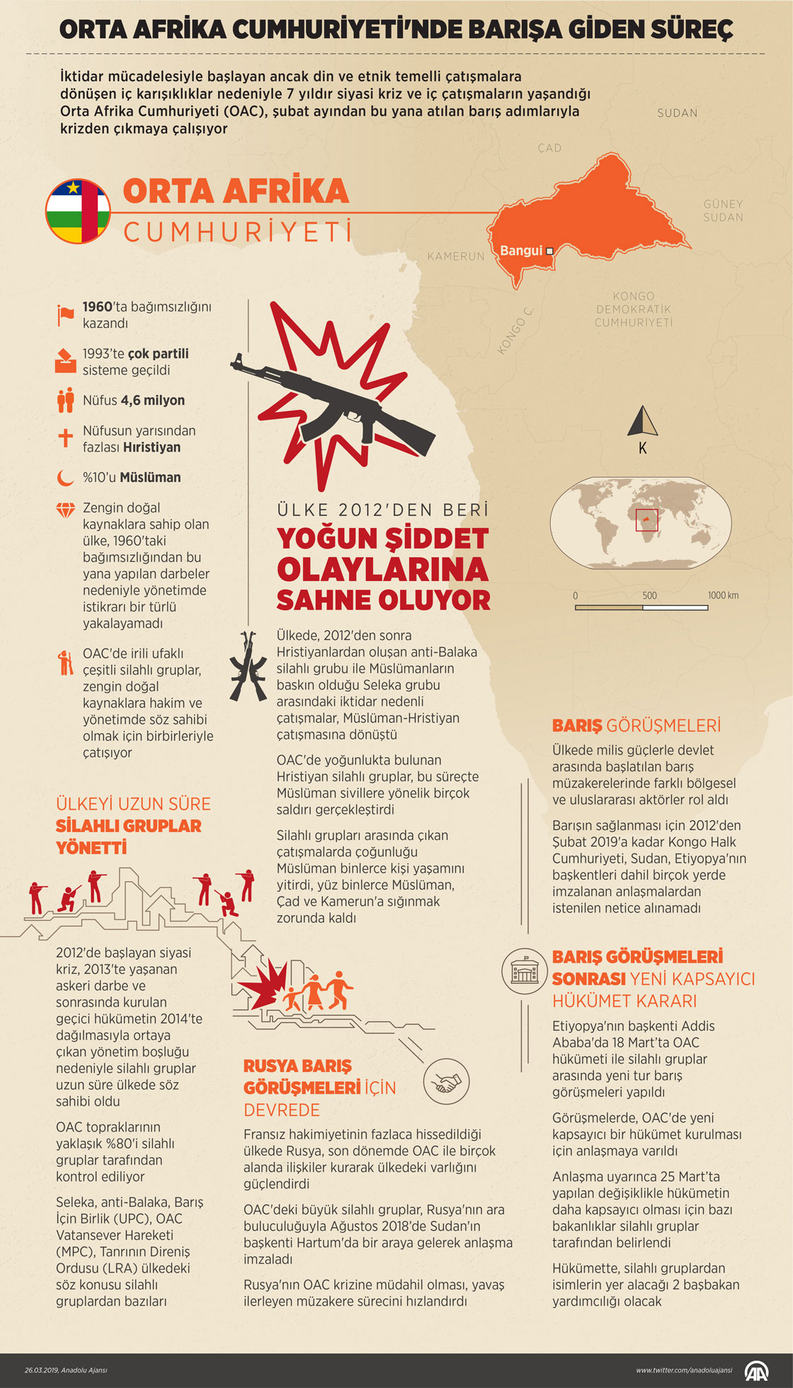 İktidar mücadelesiyle başlayan ancak din ve etnik temelli çatışmalara dönüşen iç karışıklıklar nedeniyle 7 yıldır siyasi kriz ve iç çatışmaların yaşandığı Orta Afrika Cumhuriyeti (OAC), şubat ayından bu yana atılan barış adımlarıyla krizden çıkmaya çalışıyor. ( Yasin Demirci - Anadolu Ajansı )26 Mart 2019•Güncelleme: 26 Mart 2019