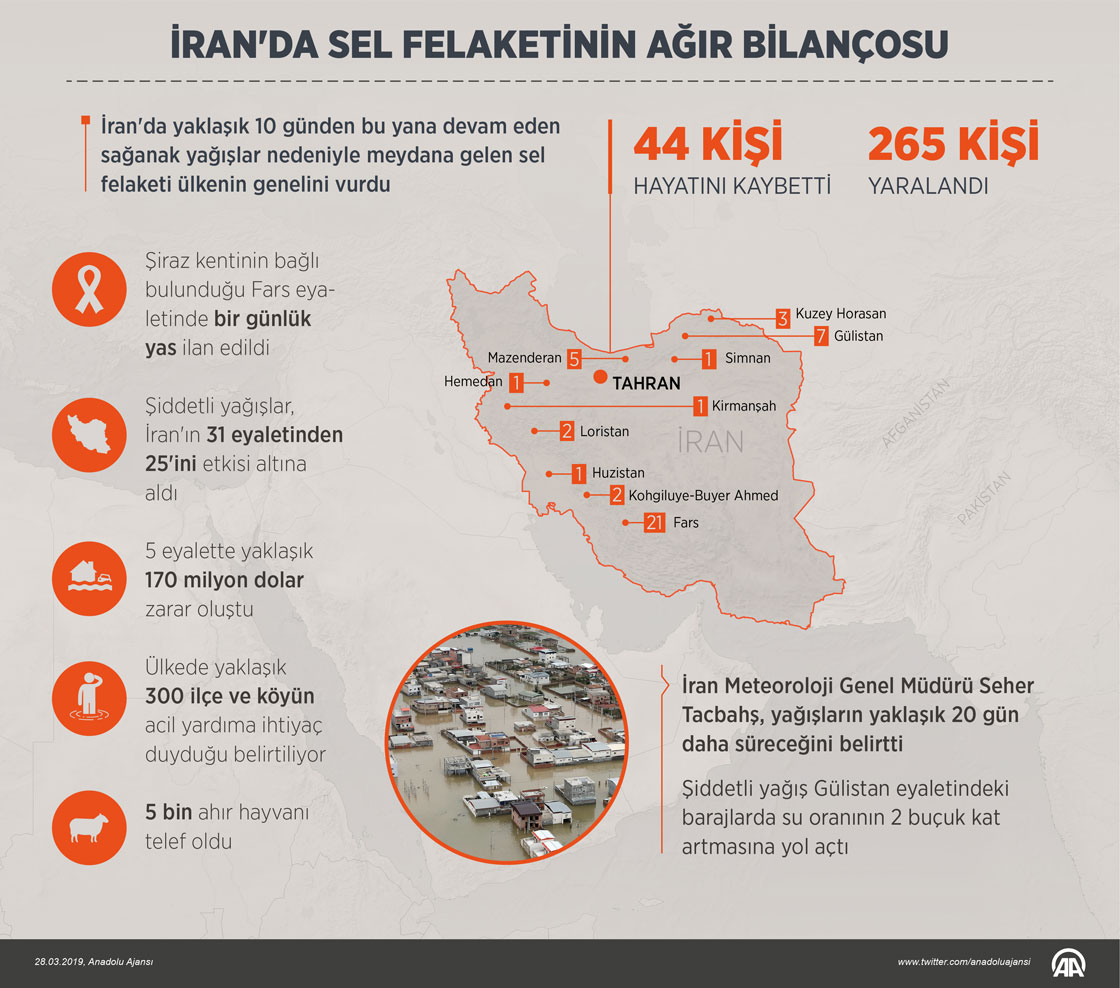 İran'da yaklaşık 10 günden buyana devam eden sağanak yağış nedeniyle meydana gelen sel felaketi ülkenin genelini vurdu, 44 kişi öldü 265 kişi yaralandı. Ülkenin 31 eyaletinden 25'ini etkisi altına alan şiddetli yağışlardan kaynaklı sel nedeniyle ülkede yaklaşık 300 ilçe ve köyün acil yardıma ihtiyaç duyduğu belirtiliyor. ( Ahmet Burak Özkan - Anadolu Ajansı )28 Mart 2019•Güncelleme: 28 Mart 2019