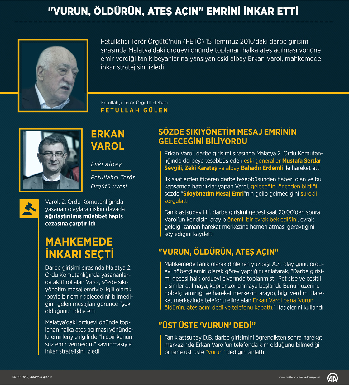 Fetullahçı Terör Örgütü'nün (FETÖ) 15 Temmuz 2016'daki darbe girişimi sırasında Malatya'daki orduevi önünde toplanan halka ateş açılması yönüne emir verdiği tanık beyanlarına yansıyan eski albay Erkan Varol, mahkemede inkar stratejisini izledi.