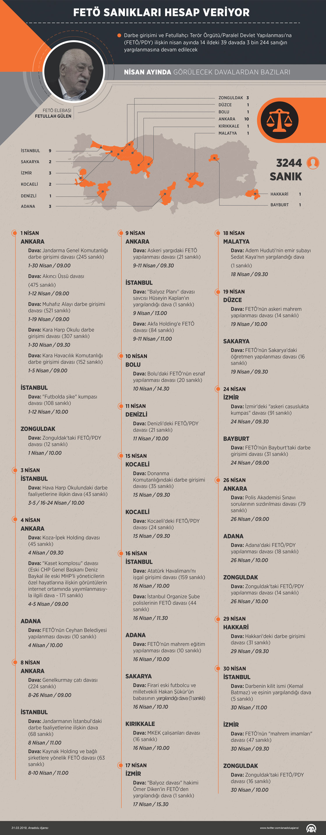 Darbe girişimi ve Fetullahçı Terör Örgütü/Paralel Devlet Yapılanması'na (FETÖ/PDY) ilişkin nisan ayında 14 ildeki 39 davada 3 bin 244 sanığın yargılanmasına devam edilecek. ( Kemal Delikmen - Anadolu Ajansı )