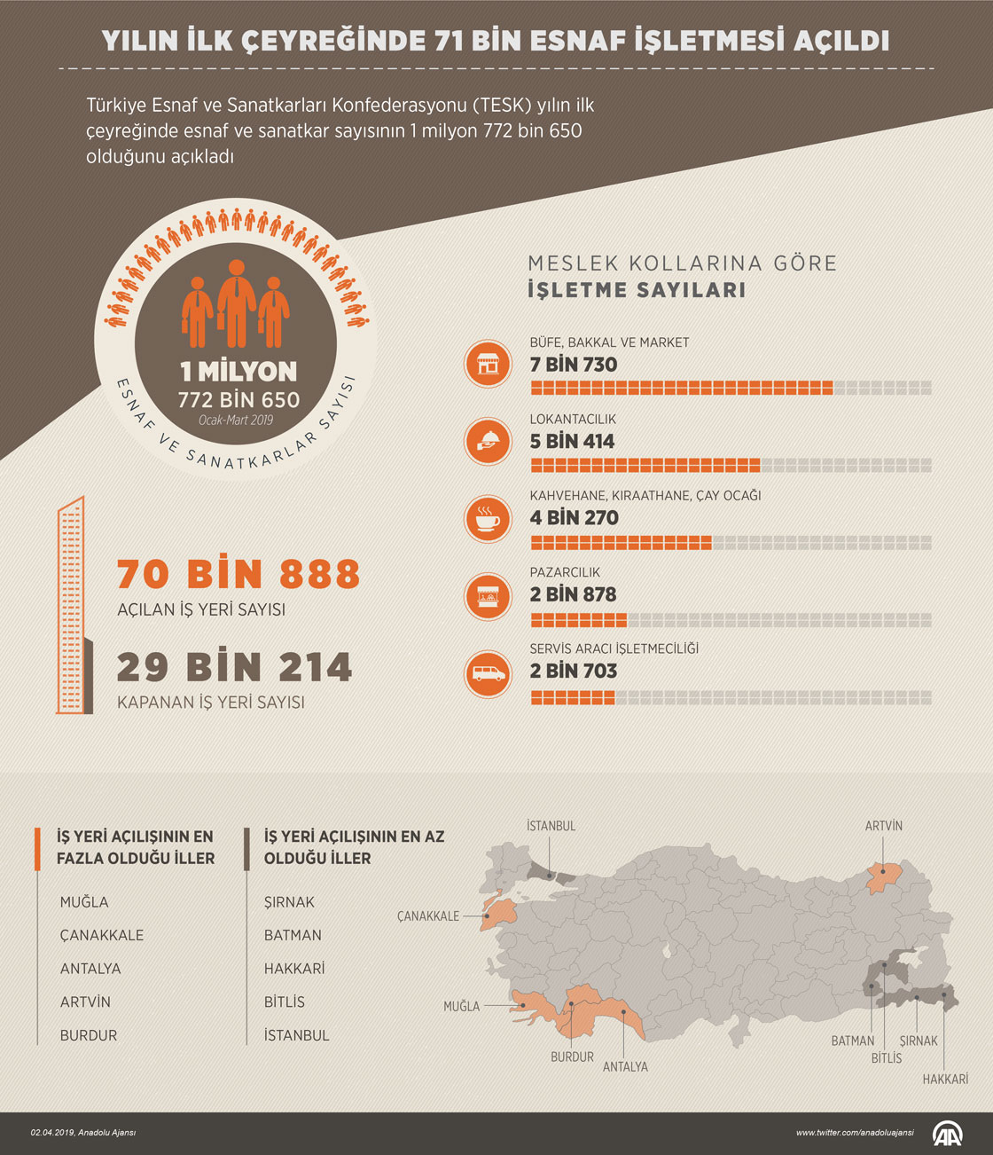Türkiye Esnaf ve Sanatkarları Konfederasyonu (TESK) Genel Başkanı Bendevi Palandöken, yılın ilk çeyreğinde esnaf ve sanatkar sayısının 1 milyon 772 bin 650 olduğunu belirterek, "Bu çeyrekte 70 bin 888 iş yeri açıldı, 29 bin 214 iş yeri kapandı." ifadesini kullandı. ( Kemal Delikmen - Anadolu Ajansı )02 Nisan 2019•Güncelleme: 02 Nisan 2019