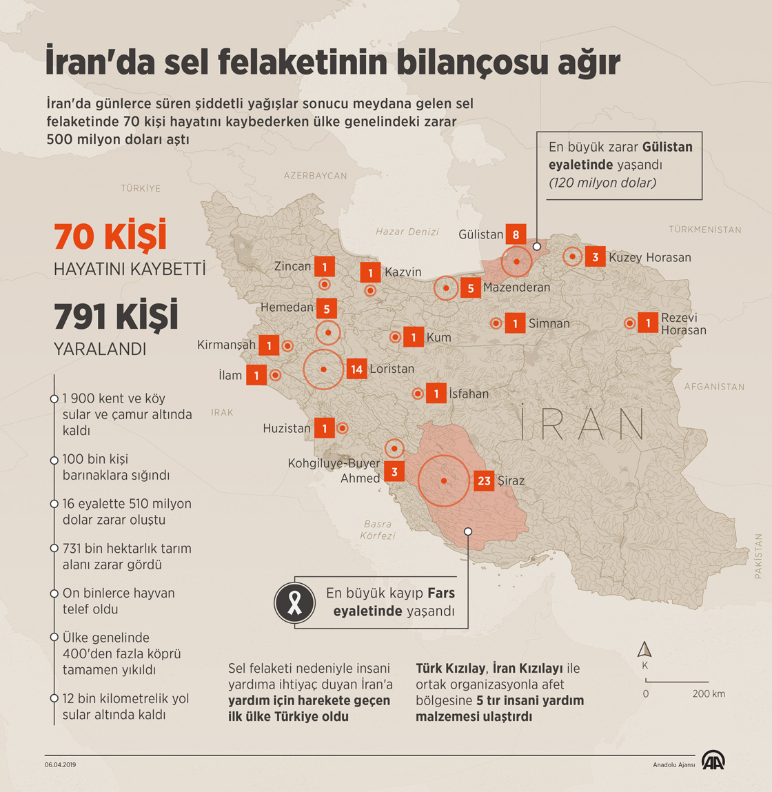 İran'da günlerce süren şiddetli yağışlar sonucu meydana gelen sel felaketinde 70 kişi hayatını kaybederken ülke genelindeki zarar 500 milyon doları aştı. ( Murat Usubaliev - Anadolu Ajansı )