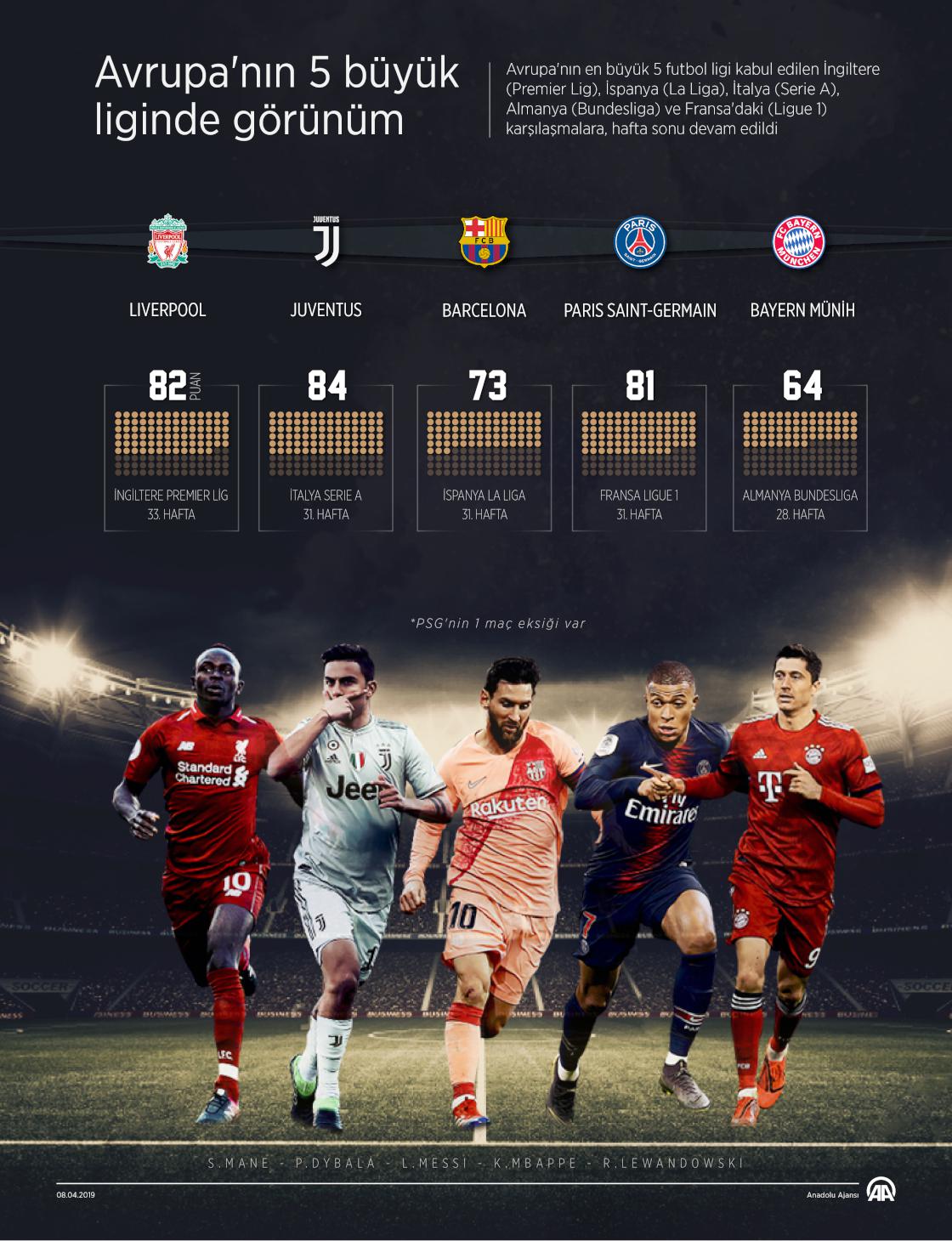 Avrupa'nın en büyük 5 futbol ligi kabul edilen İngiltere (Premier Lig), İspanya (La Liga), İtalya (Serie A), Almanya (Bundesliga) ve Fransa'daki (Ligue 1) karşılaşmalara, hafta sonu devam edildi.
