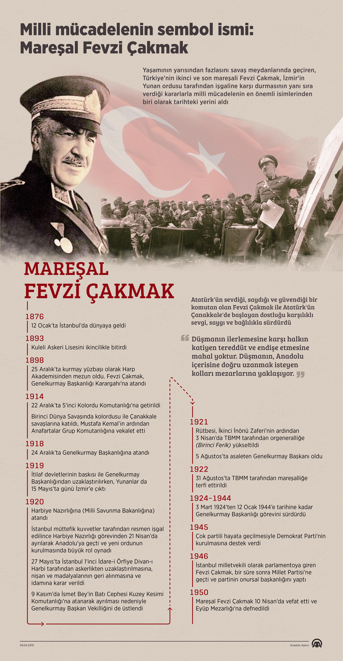 Yaşamının yarısından fazlasını savaş meydanlarında geçiren, Türkiye'nin ikinci ve son mareşali Fevzi Çakmak, İzmir'in Yunan ordusu tarafından işgaline karşı durması başta olmak üzere verdiği kararlarla milli mücadelenin en önemli isimlerinden biri olarak tarihte yerini alıyor. ( Murat Usubaliev - Anadolu Ajansı )09 Nisan 2019•Güncelleme: 09 Nisan 2019