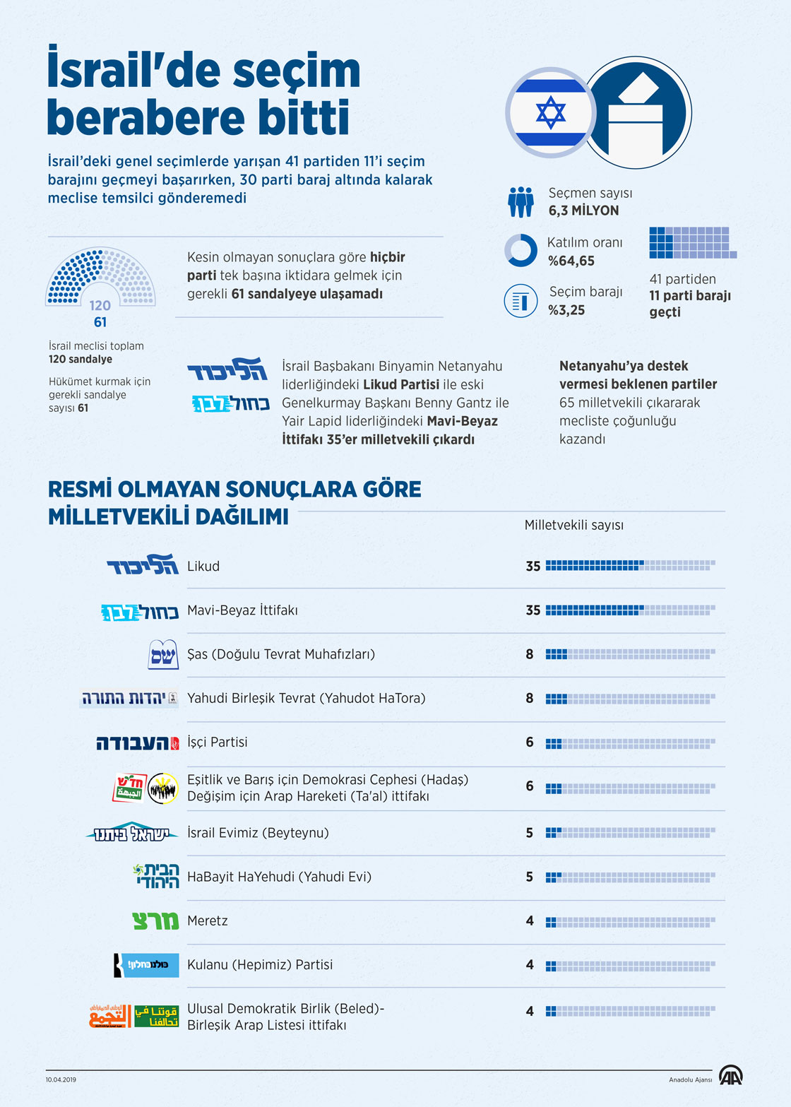 İsrail’deki genel seçimlerde yarışan 41 partiden 11’i seçim barajını geçmeyi başarırken, 30 parti baraj altında kalarak meclise temsilci gönderemedi. İsrail Başbakanı Binyamin Netanyahu liderliğindeki Likud Partisi ile eski Genelkurmay Başkanı Benny Gantz ile Yair Lapid liderliğindeki Mavi-Beyaz İttifakı 35’er milletvekili çıkardı. Netanyahu’ya destek vermesi beklenen partiler 65 milletvekili çıkararak mecliste çoğunluğu kazandı. ( Murat Usubaliev - Anadolu Ajansı )10 Nisan 2019•Güncelleme: 10 Nisan 2019