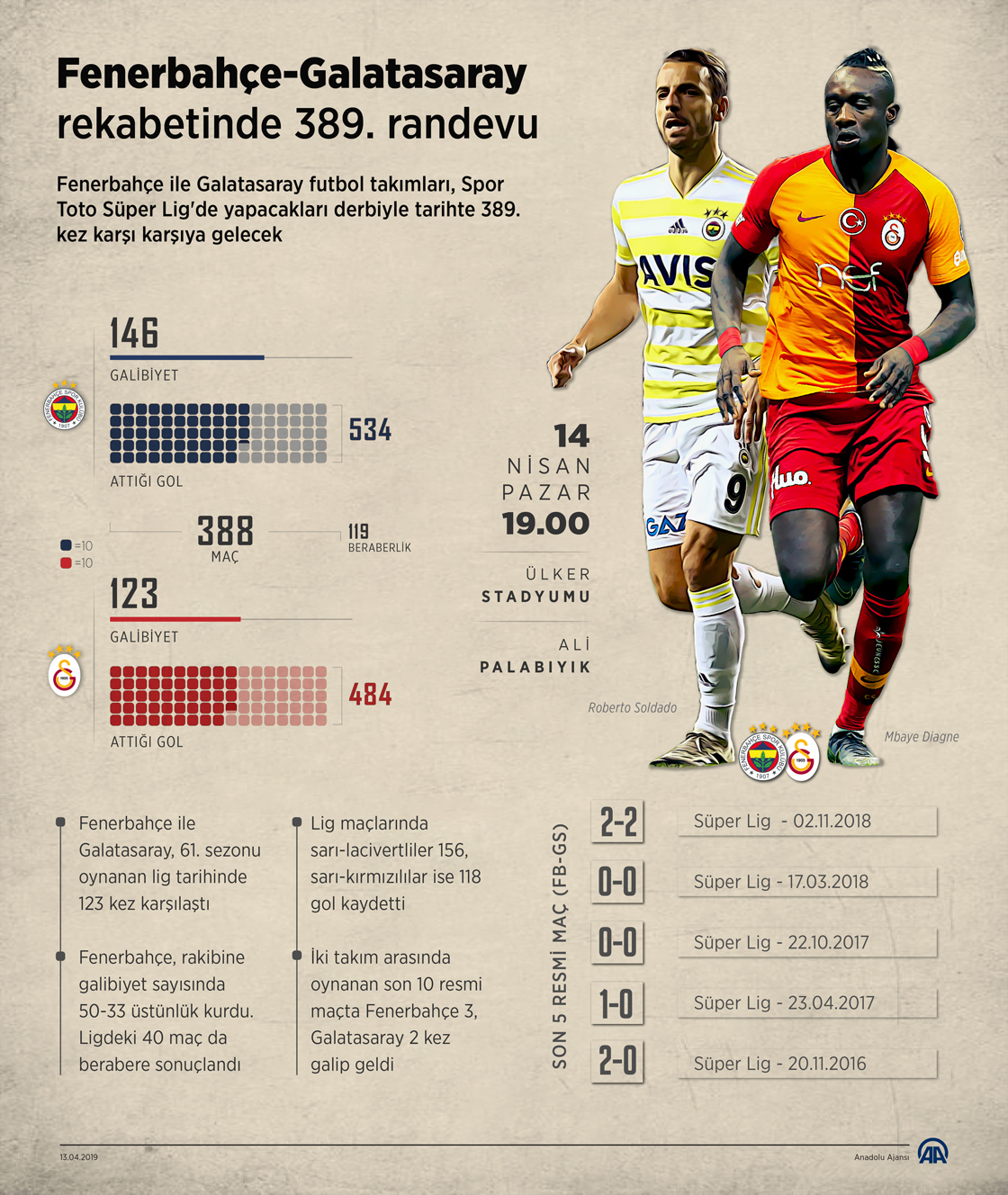 Fenerbahçe ile Galatasaray futbol takımları, Spor Toto Süper Lig'de yarın yapacakları derbiyle tarihte 389. kez karşı karşıya gelecek. İki takım arasında 110 yıllık rekabette Fenerbahçe'nin galibiyet sayısında 146-123, gol sayısında da 534-484 üstünlüğü bulunuyor. ( Gözde Gültekinler - Anadolu Ajansı )13 Nisan 2019•Güncelleme: 13 Nisan 2019