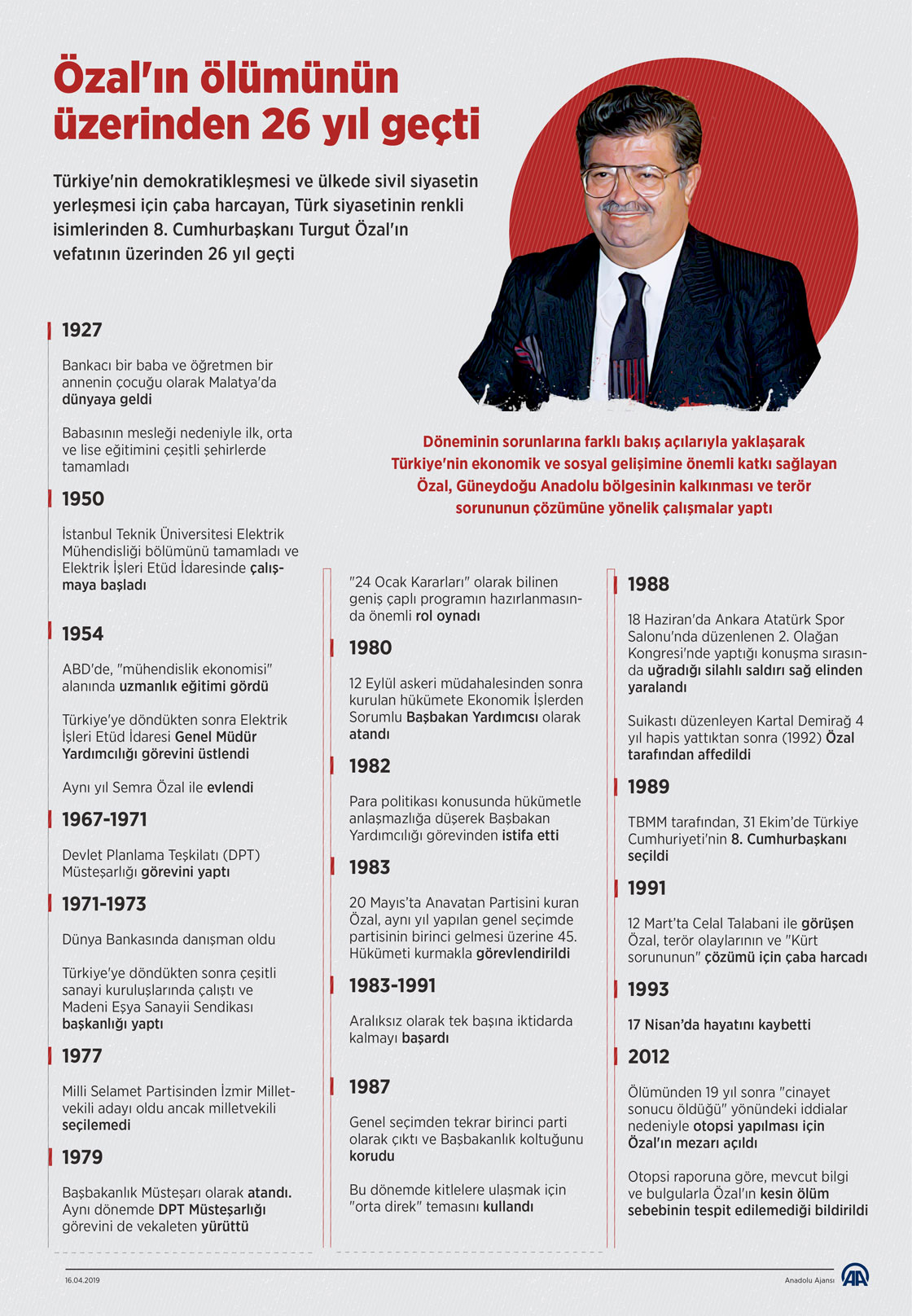 Türkiye'nin demokratikleşmesi ve ülkede sivil siyasetin yerleşmesi için çaba harcayan, Türk siyasetinin renkli isimlerinden 8. Cumhurbaşkanı Turgut Özal'ın vefatının üzerinden 26 yıl geçti. ( Mahmut Resul Karaca - Anadolu Ajansı )