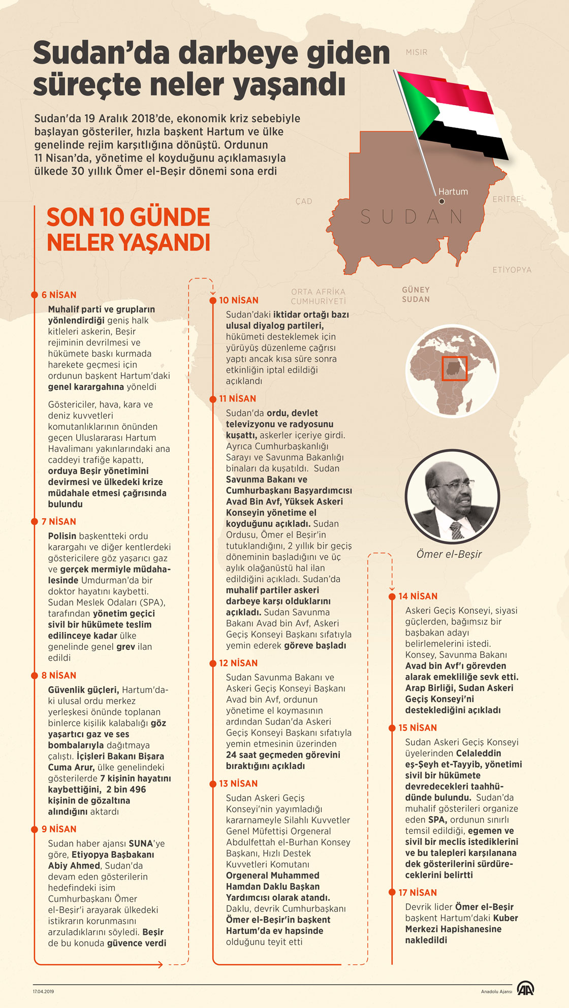 Sudan'da 19 Aralık 2018’de, ekonomik kriz sebebiyle başlayan gösteriler, hızla başkent Hartum ve ülke genelinde rejim karşıtlığına dönüştü. Ordunun 11 Nisan’da, yönetime el koyduğunu açıklamasıyla ülkede 30 yıllık Ömer el-Beşir dönemi sona erdi. ( Murat Usubaliev - Anadolu Ajansı )17 Nisan 2019•Güncelleme: 17 Nisan 2019