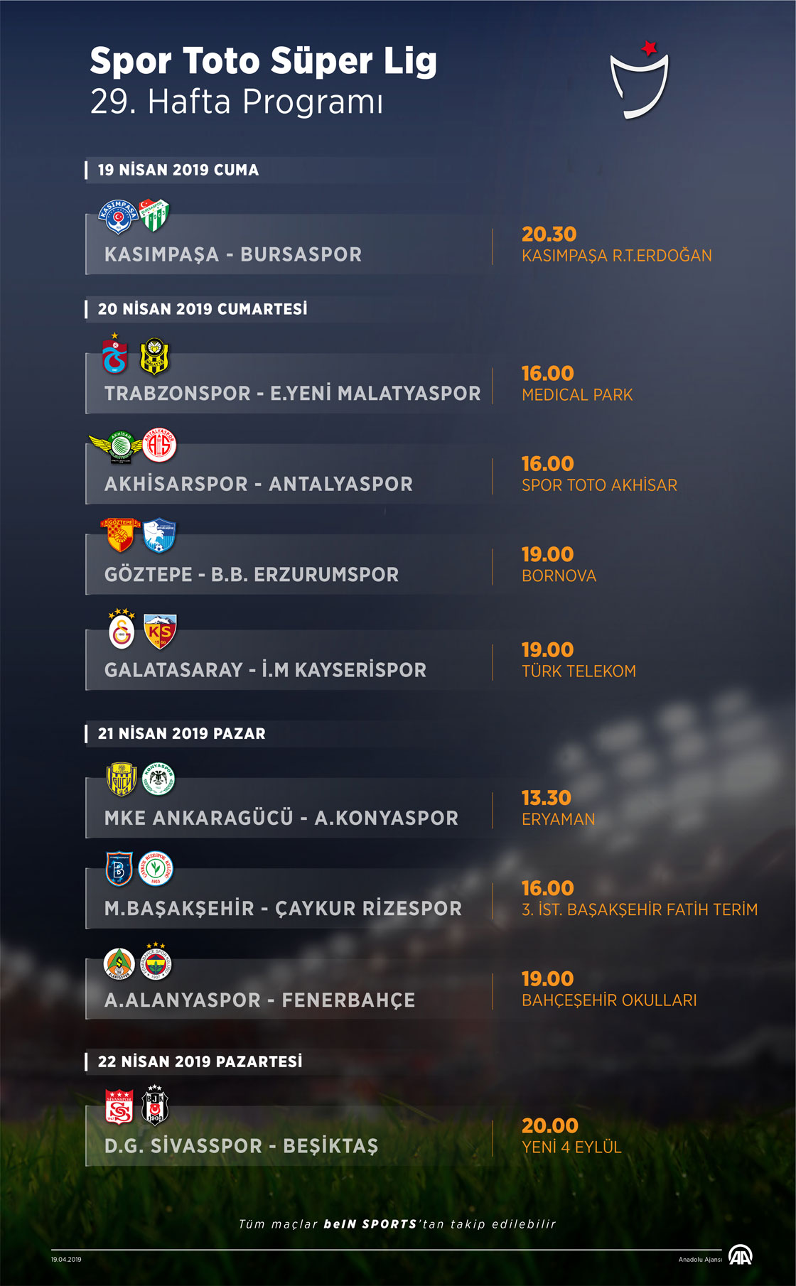 Spor Toto Süper Lig'in 29. haftasında ilk maç 19 Nisan Cuma günü Kasımpaşa ile Bursaspor arasında oynanacak. 20 Nisan Cumartesi günü 4, 21 Nisan Pazar günü 3 ve 22 Nisan Pazartesi günü ise tek maç oynanacak. ( Kemal Delikmen - Anadolu Ajansı )