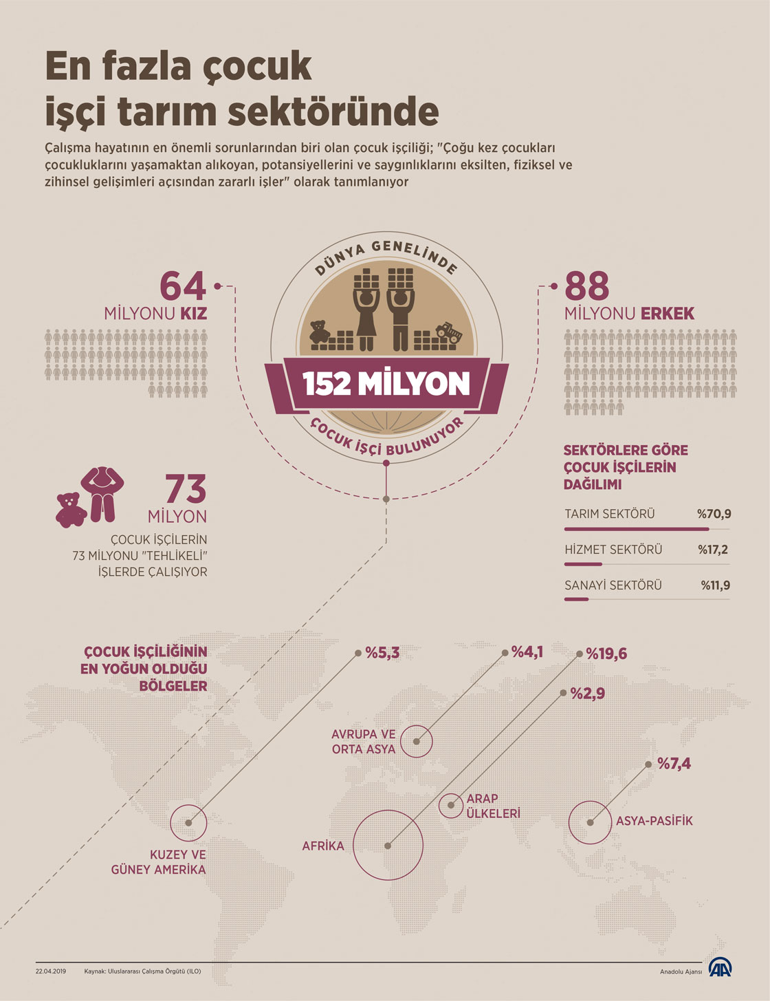 Uluslararası Çalışma Örgütünün (ILO) raporuna göre, tüm dünyada 73 milyonu "tehlikeli" işlerde olmak üzere halen 152 milyon çocuk işçi bulunuyor. Tarım yüzde 70,9'luk oranla çocuk işçilerin en fazla olduğu sektör durumundayken, tarımı sırasıyla hizmet ve sanayi sektörü izliyor. ( Yasin Demirci - Anadolu Ajansı )22 Nisan 2019•Güncelleme: 22 Nisan 2019