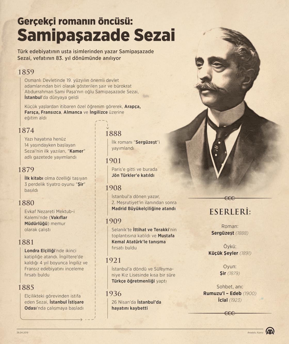 Türk edebiyatında romantizmden realizme geçiş eseri olarak kabul edilen "Sergüzeşt" romanını kaleme alan öykü ve roman yazarı Samipaşazade Sezai'nin vefatının üzerinden 83 yıl geçti. ( Murat Usubaliev - Anadolu Ajansı )