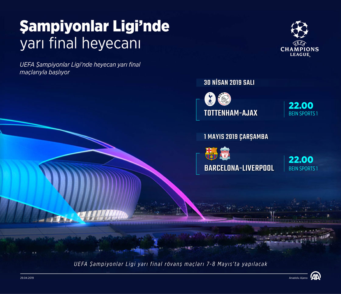 Avrupa futbolunun kulüp düzeyindeki en önemli organizasyonu UEFA Şampiyonlar Ligi'nde yarı final heyecanı yarın başlıyor. İlk yarı final maçında yarın İngiltere ekibi Tottenham, Hollanda temsilcisi Ajax'ı Tottenham Hotspur Stadı'nda konuk edecek. Yarı finalin diğer ayağında ise 1 Mayıs Çarşamba günü İspanya'nın Barcelona takımı, Camp Nou Stadı'nda İngiltere'nin Liverpool ekibini ağırlayacak. ( Kemal Delikmen - Anadolu Ajansı )29 Nisan 2019•Güncelleme: 29 Nisan 2019