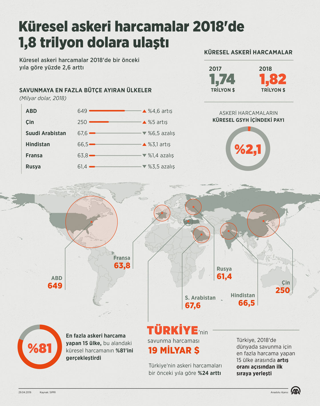 Küresel askeri harcamalar 2018'de bir önceki yıla göre yüzde 2,6 artarak 1,8 trilyon dolara ulaşırken, dünyada savunmaya en fazla bütçe ayıran ülkeler ABD, Çin, Suudi Arabistan, Hindistan ve Fransa oldu. ( Murat Usubaliev - Anadolu Ajansı )29 Nisan 2019•Güncelleme: 29 Nisan 2019