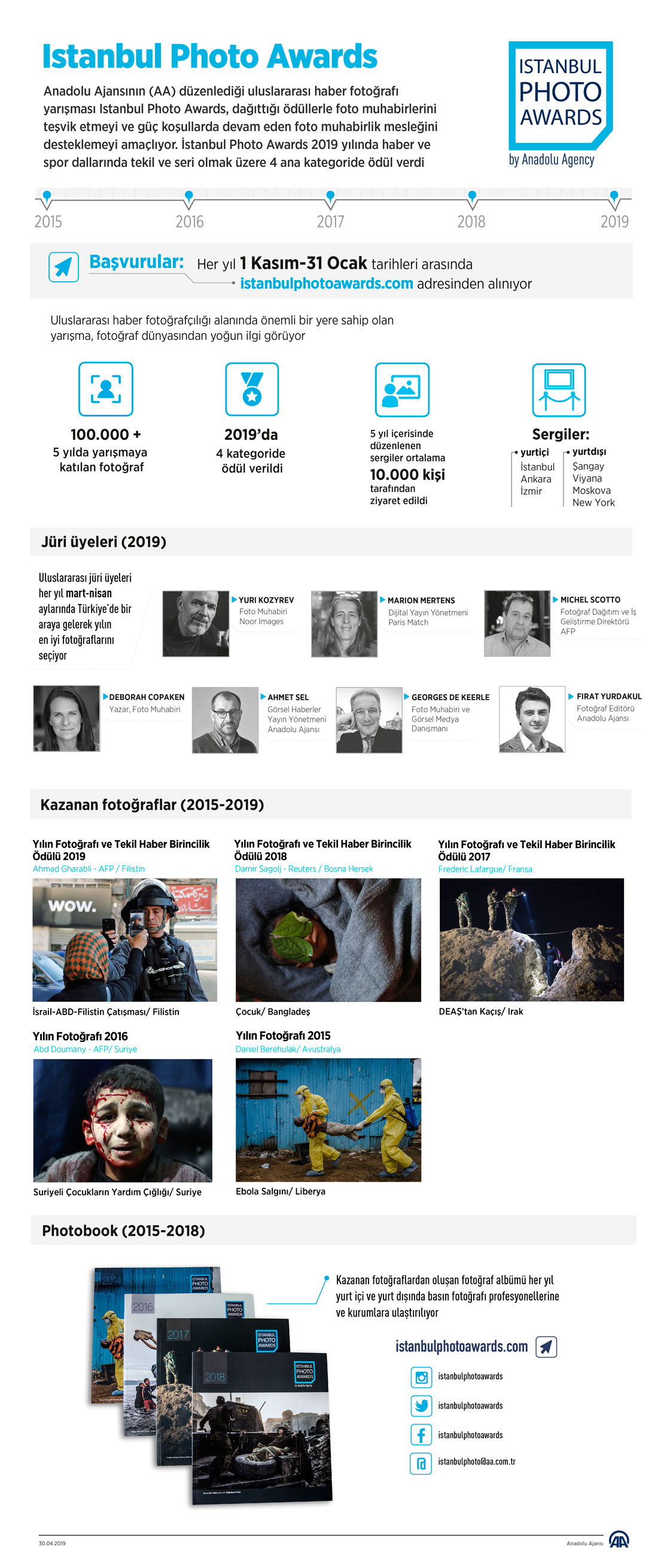 Anadolu Ajansının (AA) düzenlediği uluslararası haber fotoğrafı yarışması Istanbul Photo Awards, dağıttığı ödüllerle foto muhabirlerini teşvik etmeyi ve güç koşullarda devam eden foto muhabirlik mesleğini desteklemeyi amaçlıyor. İstanbul Photo Awards 2019 yılında haber ve spor dallarında tekil ve seri olmak üzere 4 ana kategoride ödül verdi. ( Gözde Gültekinler - Anadolu Ajansı )30 Nisan 2019•Güncelleme: 30 Nisan 2019