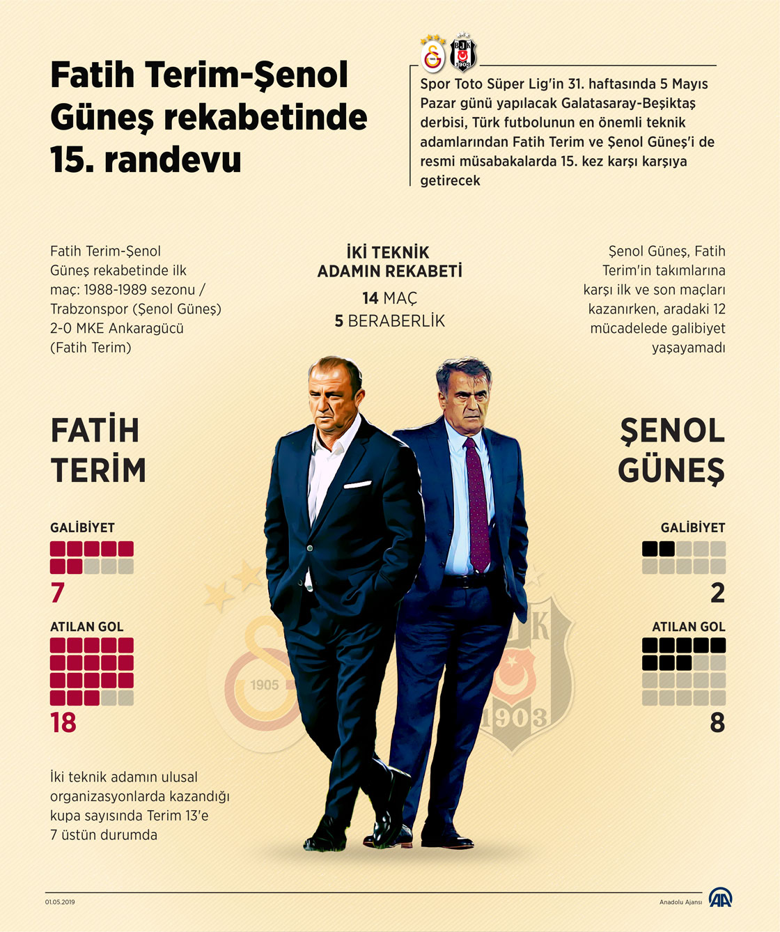 Spor Toto Süper Lig'in 31. haftasında 5 Mayıs Pazar günü yapılacak Galatasaray-Beşiktaş derbisi, Türk futbolunun en önemli teknik adamlarından Fatih Terim ile Şenol Güneş'i de resmi müsabakalarda 15. kez karşı karşıya getirecek. ( Muhammed Ali Yiğit - Anadolu Ajansı )01 Mayıs 2019•Güncelleme: 01 Mayıs 2019
