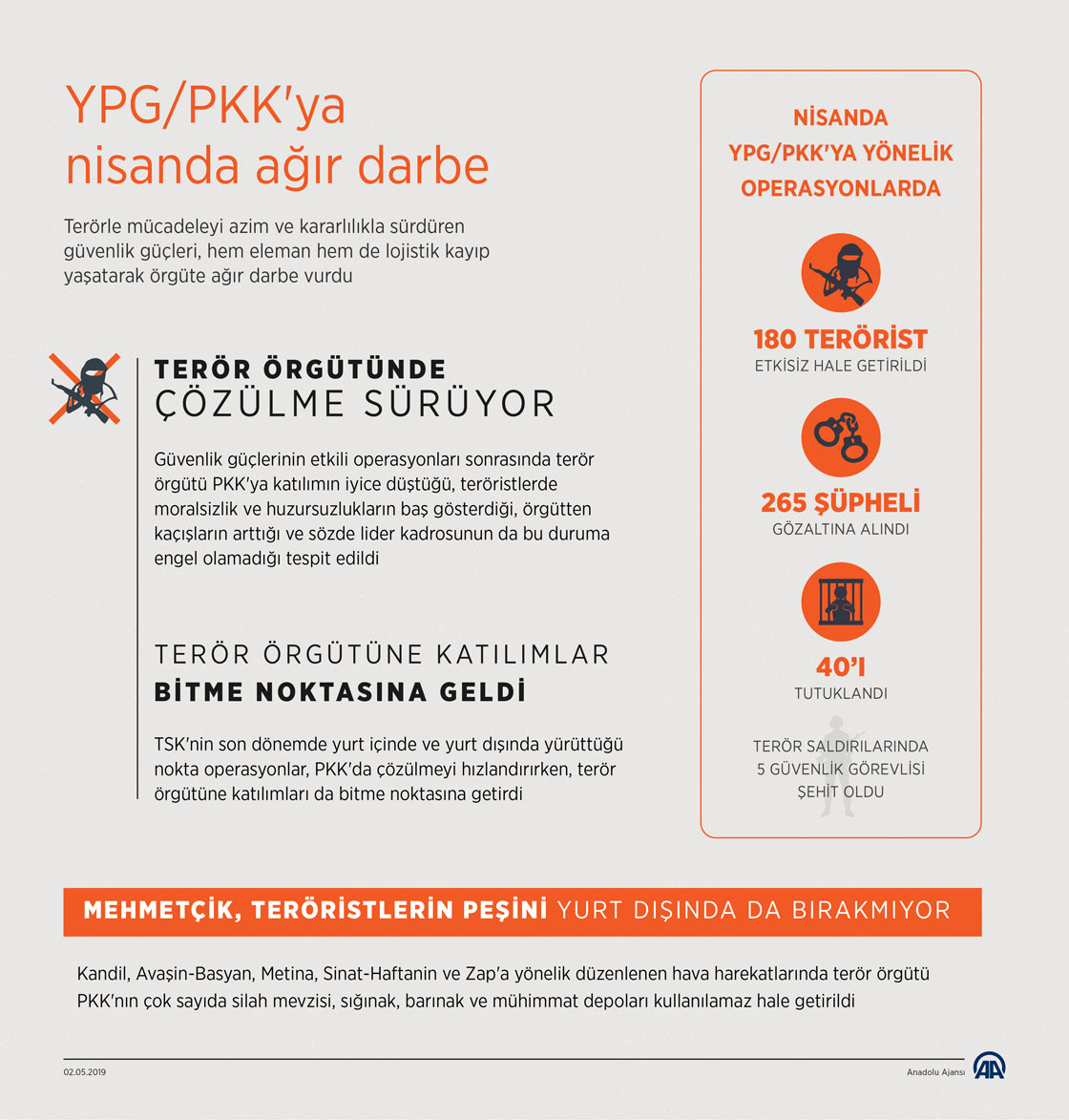 Türkiye'nin barış, huzur ve güvenliğini bozmak için sivilleri, çocukları ve bebekleri dahi hedef almaktan çekinmeyen terör örgütü YPG/PKK'ya yönelik nisan ayında düzenlenen operasyonlarda 180 terörist etkisiz hale getirilerek örgüte ağır darbe indirildi. ( Kemal Delikmen - Anadolu Ajansı )02 Mayıs 2019•Güncelleme: 02 Mayıs 2019