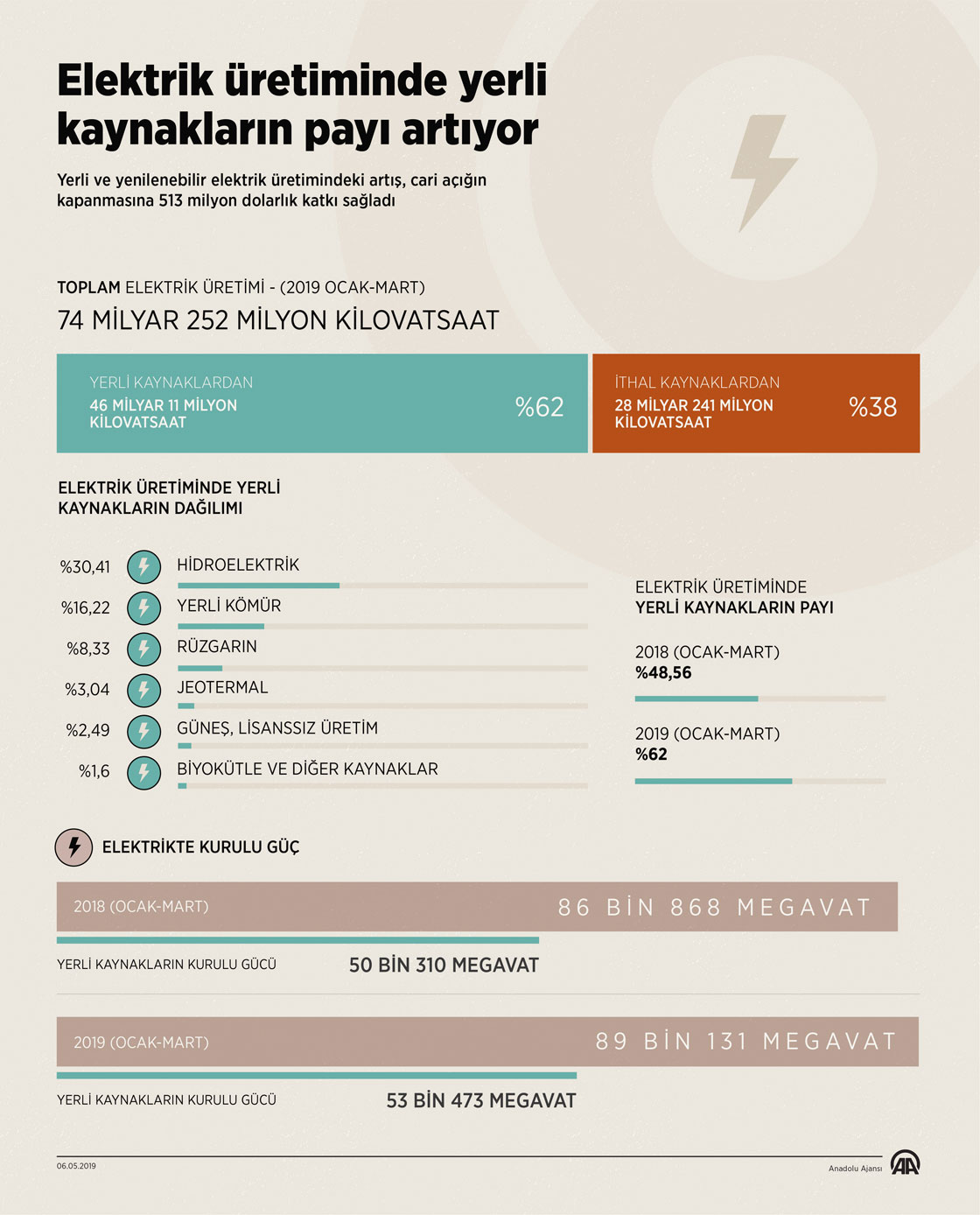 Türkiye'de yılın ilk çeyreğinde üretilen elektriğin yüzde 62'si yerli ve yenilenebilir enerji kaynaklarından karşılandı. Üretimdeki bu artış, cari açığın kapanmasına 513 milyon dolarlık katkı sağladı. ( Ahmet Burak Özkan - Anadolu Ajansı )