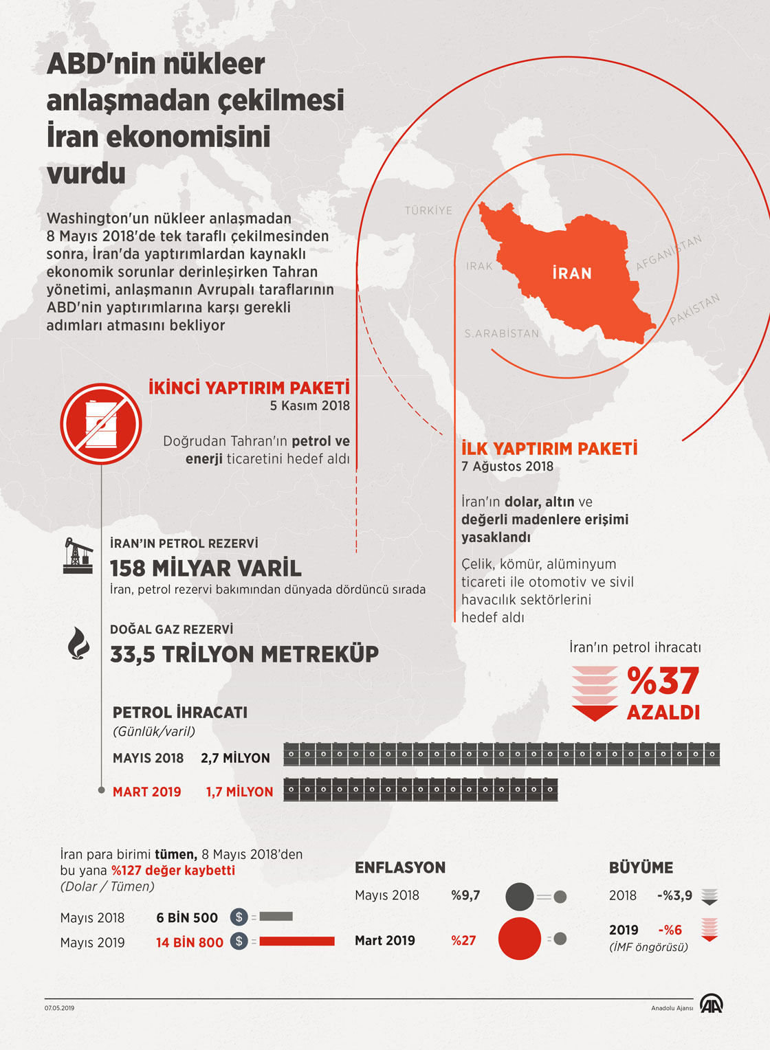 Washington'un nükleer anlaşmadan 8 Mayıs 2018'de tek taraflı çekilmesinden sonra, İran'da yaptırımlardan kaynaklı ekonomik sorunlar derinleşirken Tahran yönetimi, anlaşmanın Avrupalı taraflarının ABD'nin yaptırımlarına karşı gerekli adımları atmasını bekliyor. ( Murat Usubaliev - Anadolu Ajansı )07 Mayıs 2019•Güncelleme: 07 Mayıs 2019