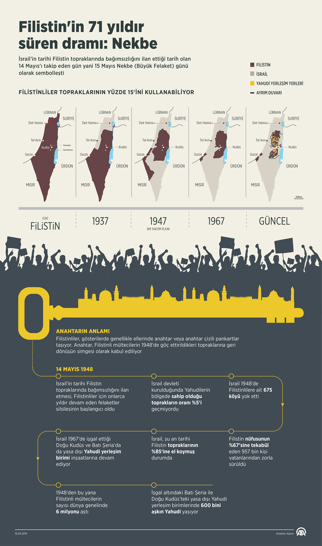 İsrail'in 14 Mayıs 1948'de tarihi Filistin topraklarında bağımsızlığını ilan etmesi, Filistinliler için onlarca yıldır devam eden felaketler silsilesinin başlangıcı oldu.