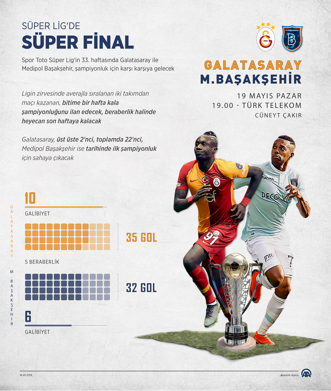 Spor Toto Süper Lig'in 33. haftasında Galatasaray ile Medipol Başakşehir, yarın şampiyonluk için karşı karşıya gelecek. ( GRAFİK: Kemal Delikmen - Anadolu Ajansı )