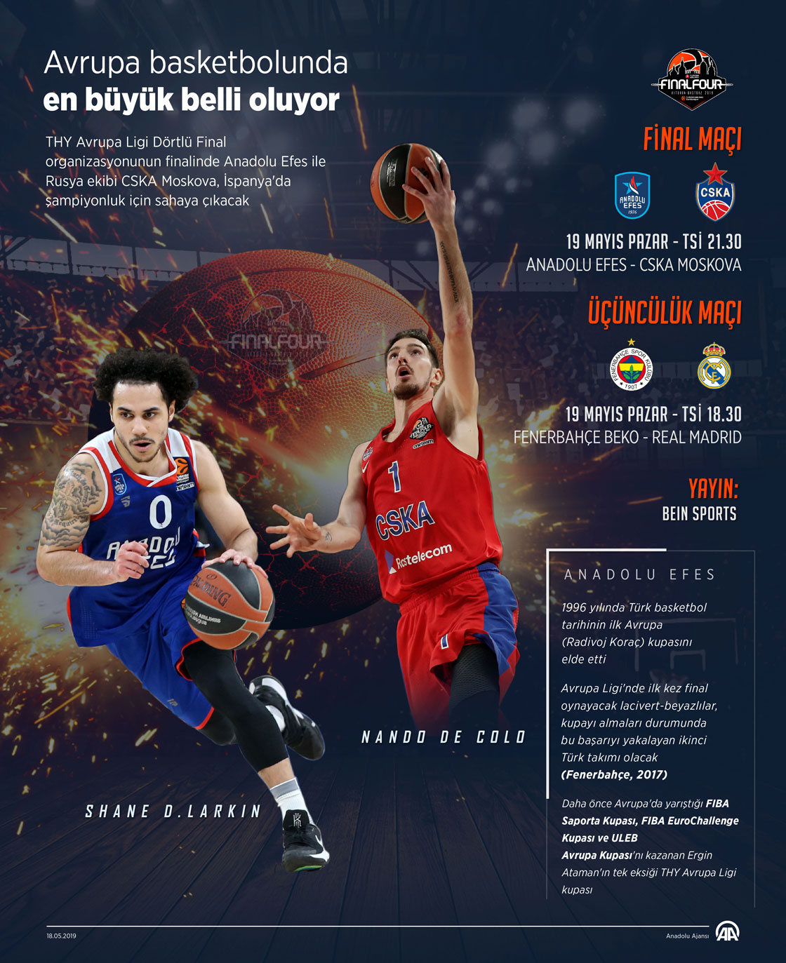 Basketbolda THY Avrupa Ligi Dörtlü Final organizasyonunun finalinde Anadolu Efes ile Rusya ekibi CSKA Moskova yarın şampiyonluk için sahaya çıkacak. ( Gözde Gültekinler - Anadolu Ajansı )