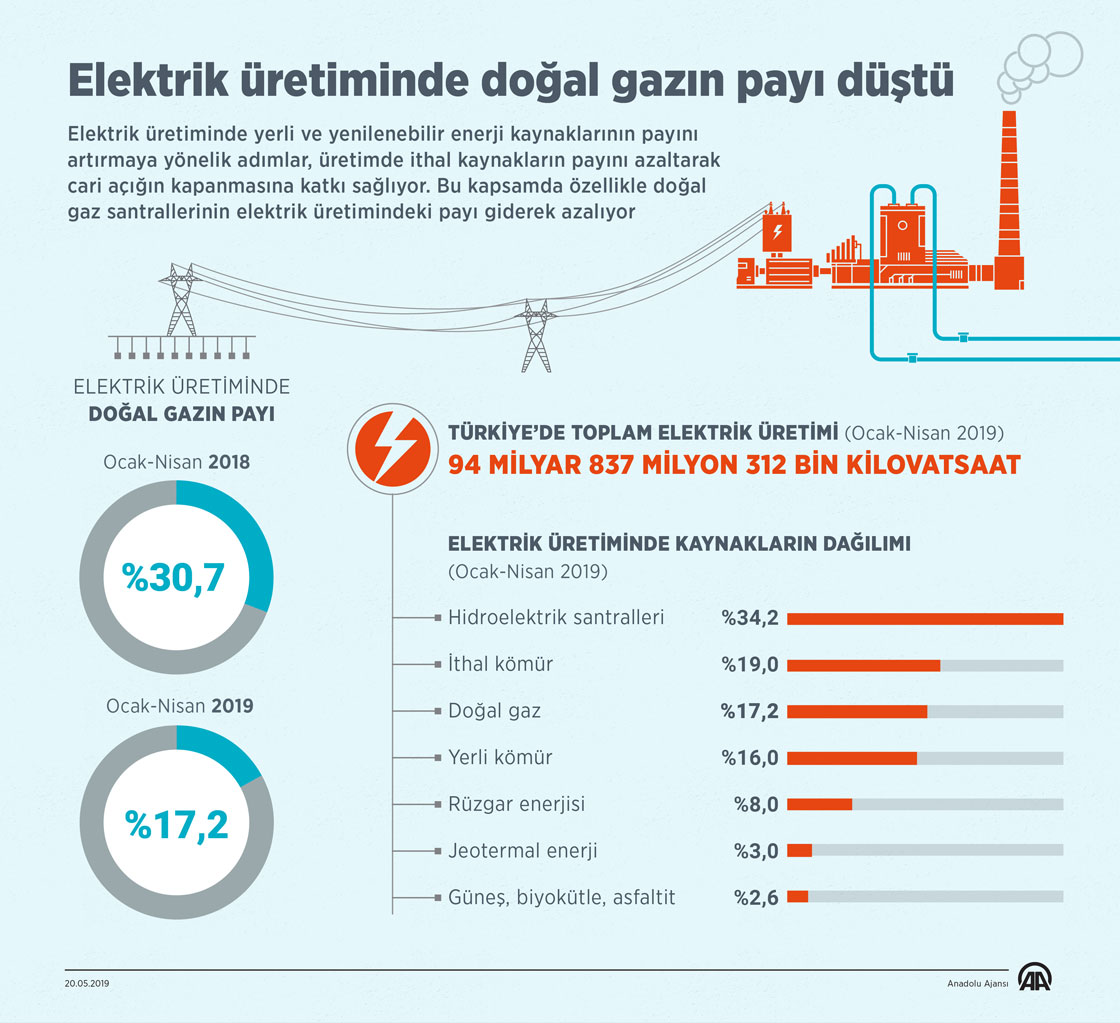 Elektrik üretiminde yerli ve yenilenebilir enerji kaynaklarının payını artırmaya yönelik adımlar, üretimde ithal kaynakların payını azaltarak cari açığın kapanmasına katkı sağlıyor. Bu kapsamda özellikle doğal gaz santrallerinin elektrik üretimindeki payı giderek azalıyor. ( Murat Usubaliev - Anadolu Ajansı )20 Mayıs 2019•Güncelleme: 20 Mayıs 2019