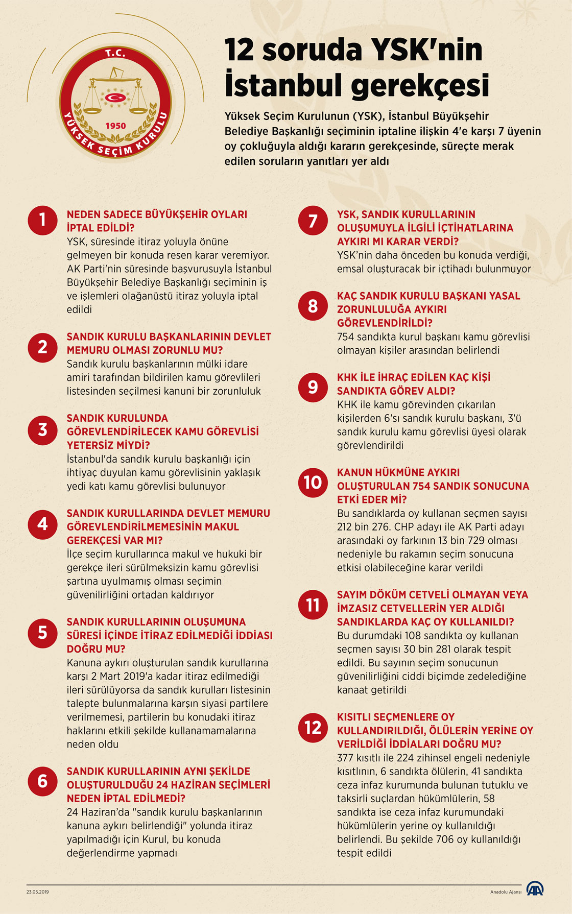 Yüksek Seçim Kurulunun (YSK), İstanbul Büyükşehir Belediye Başkanlığı seçiminin iptaline ilişkin 4'e karşı 7 üyenin oy çokluğuyla aldığı kararın gerekçesinde, süreçte merak edilen soruların yanıtları yer aldı. ( Ahmet Burak Özkan - Anadolu Ajansı )