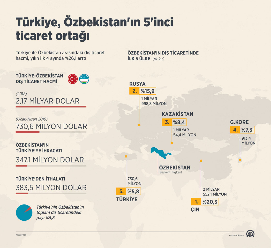 Türkiye ile Özbekistan arasındaki ticaret hacmi yılın ilk 4 ayında yüzde 26,1 artarak 730,6 milyon dolara ulaşırken, Türkiye, Özbekistan'ın 5. büyük ticaret ortağı oldu. ( Ahmet Burak Özkan - Anadolu Ajansı )