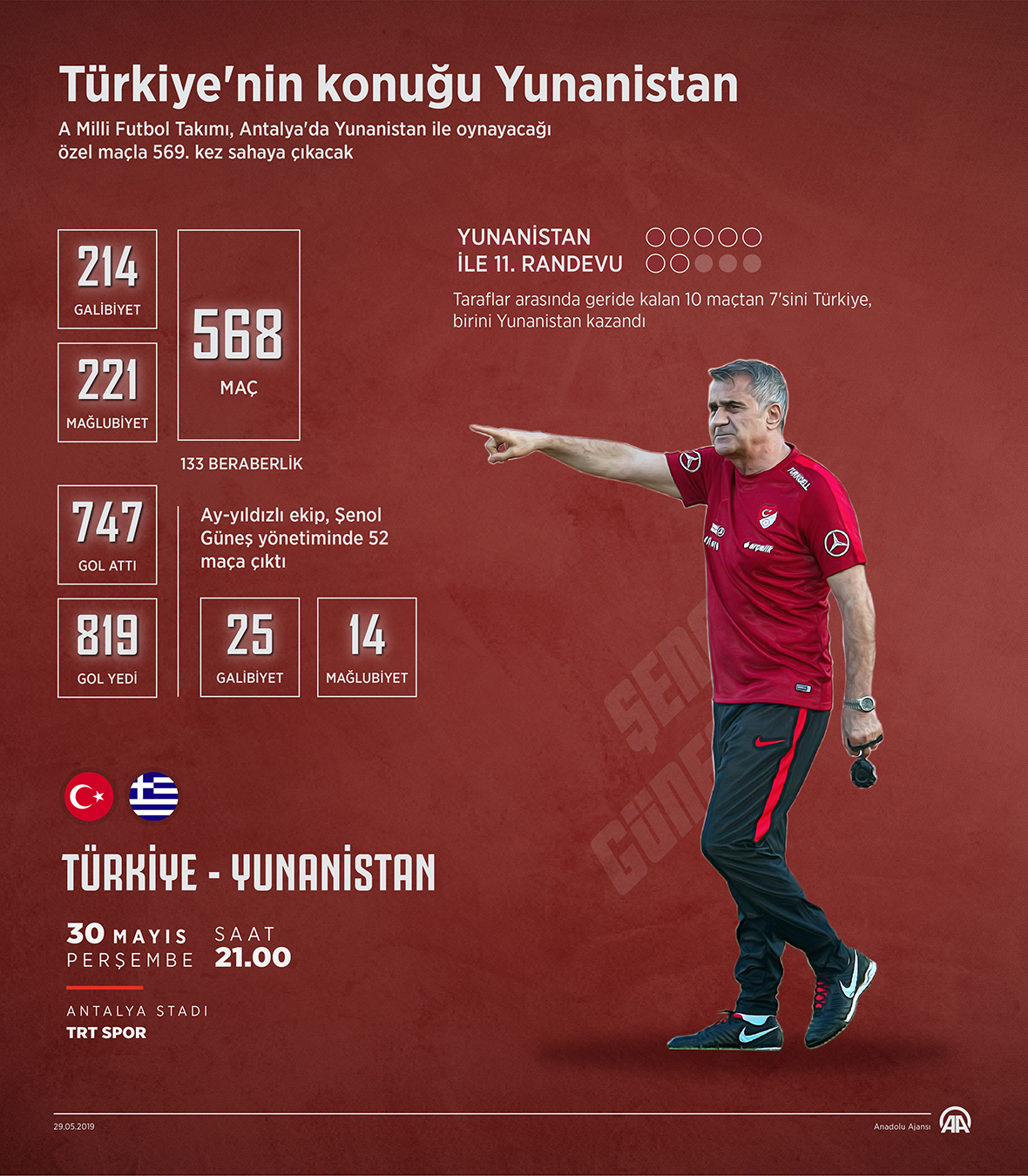 A Milli Futbol Takımı, Yunanistan ile yarın Antalya'da yapacağı özel maçla 569. kez sahaya çıkacak. Türk Milli Takımı 568 maçta, biri hükmen olmak üzere 214 galibiyet aldı, 133 defa berabere kaldı, 221 kez de rakiplerine yenildi. (Ahmet Burak Özkan - Anadolu Ajansı )29 Mayıs 2019•Güncelleme: 29 Mayıs 2019