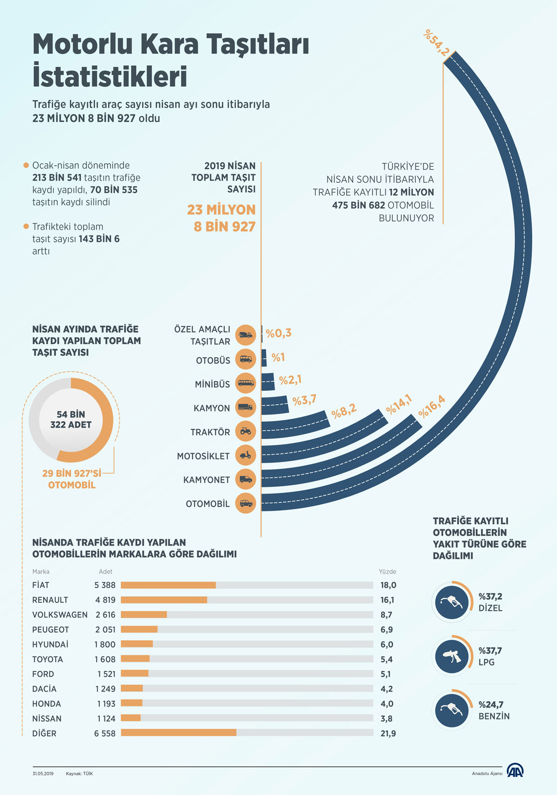 Türkiye'de ocak-nisan döneminde 213 bin 541 taşıtın trafiğe kaydı yapıldı, 70 bin 535 aracın kaydı silindi. Böylece trafikteki toplam taşıt sayısı 143 bin 6 artış gösterdi. ( Yasin Demirci - Anadolu Ajansı )