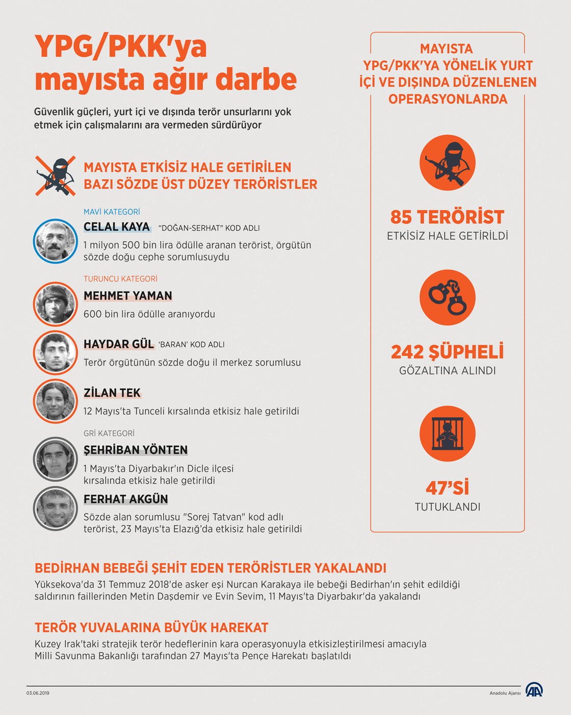 Türkiye'nin barış, huzur ve güvenliğini bozmak için sivilleri, çocukları ve bebekleri dahi hedef almaktan çekinmeyen terör örgütü YPG/PKK'ya yönelik mayısta düzenlenen operasyonlarda aralarında örgütün sözde sorumlularının da bulunduğu 85 terörist etkisiz hale getirilerek örgüte ağır darbe indirildi. ( Yasin Demirci - Anadolu Ajansı )03 Haziran 2019•Güncelleme: 03 Haziran 2019