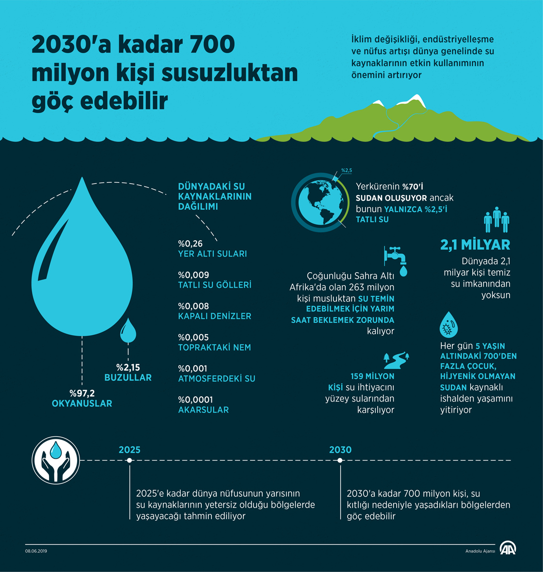 Dünya genelinde 2030'a kadar 700 milyon kişinin su kıtlığı nedeniyle yaşadıkları bölgelerden göç etmek zorunda kalacakları tahmin ediliyor.