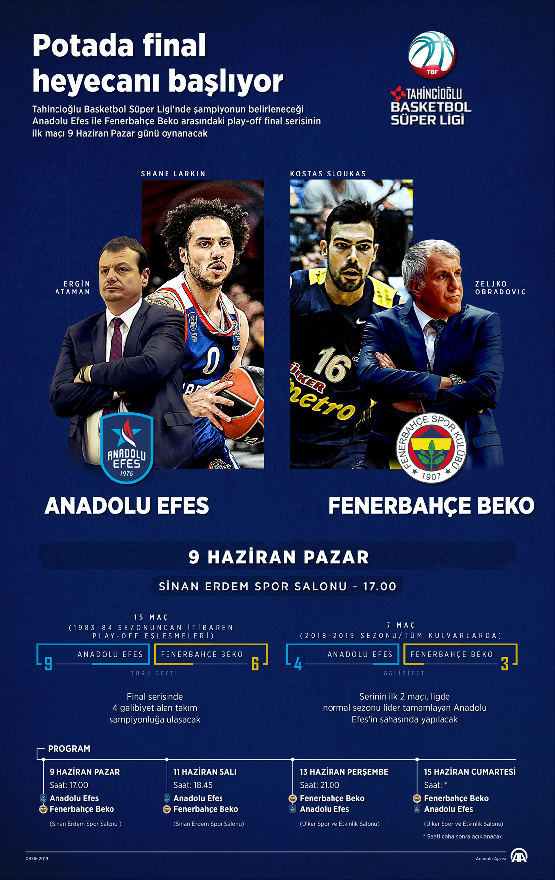 Tahincioğlu Basketbol Süper Ligi'nde Anadolu Efes ile Fenerbahçe Beko'nun karşılaşacağı ve şampiyonun belirleneceği play-off final serisinin ilk maçı yarın oynanacak.